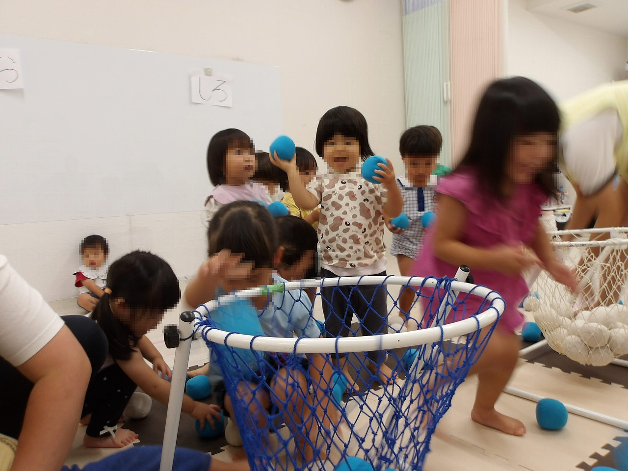 今週の文字遊びPは「あお」「しろ」で玉入れをして遊びました。