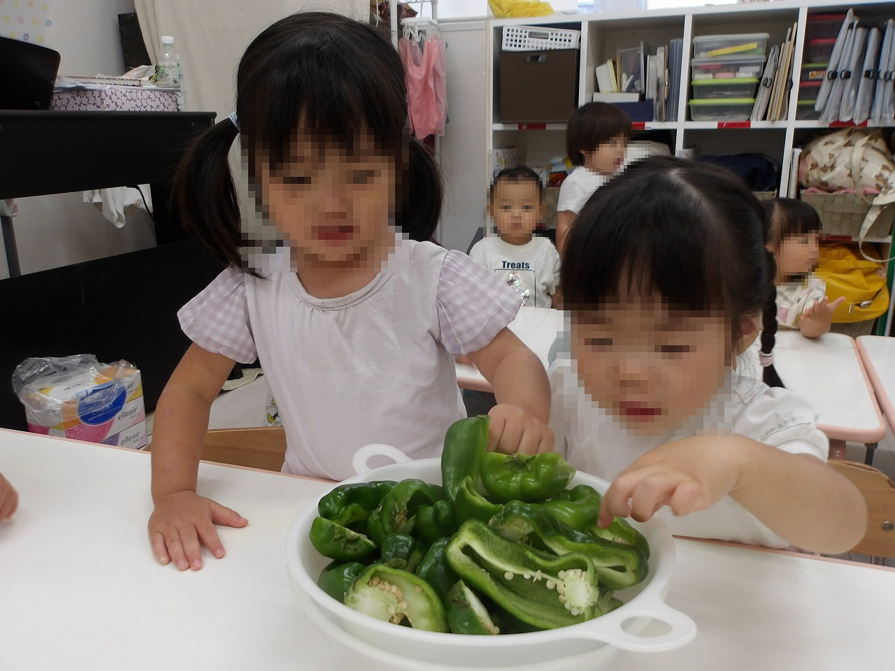 縦に半分に切ったピーマンを選び、真剣な表情で種を取る子ども達、みんなで種を取ったピーマンは鮭のちゃんちゃん焼きになり、美味しくいただきました(^-^)。