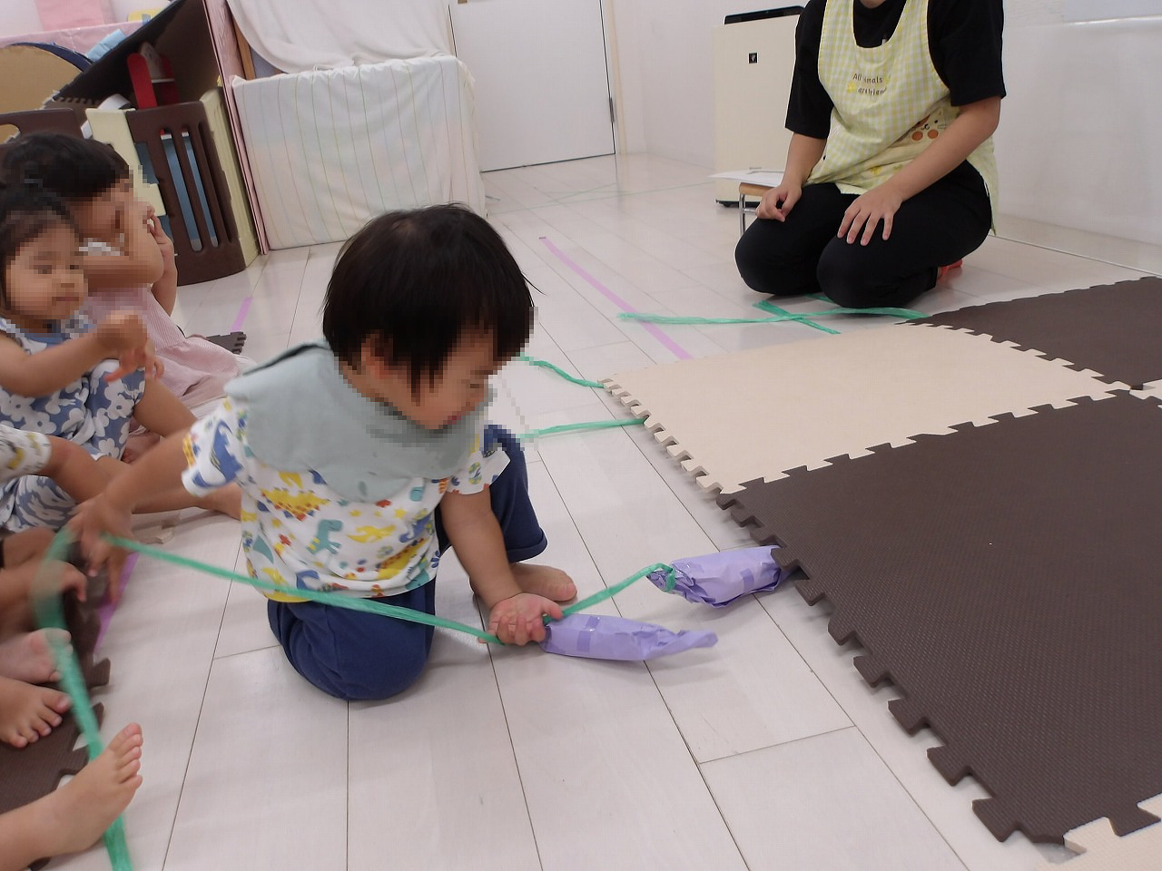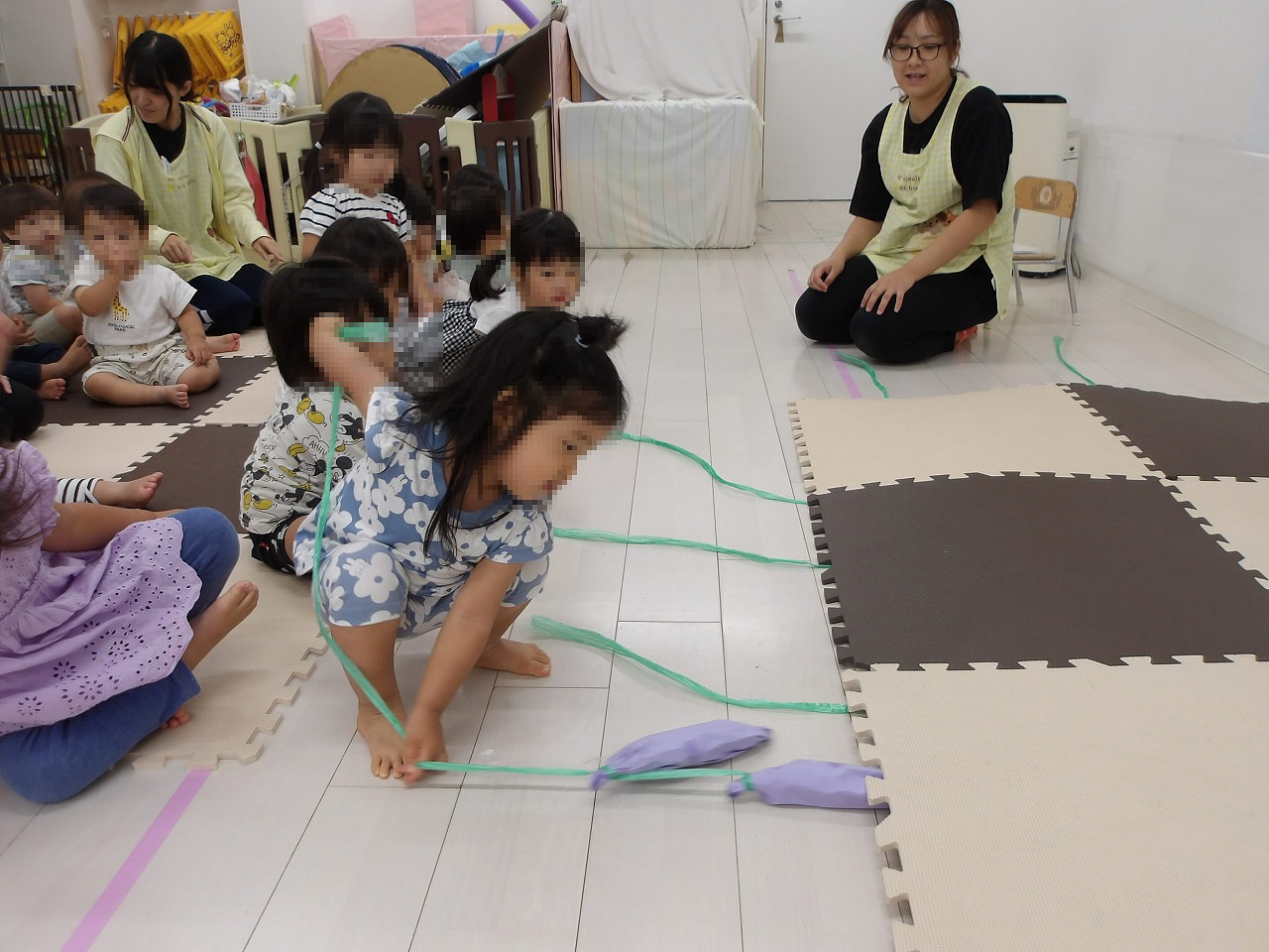 マットから出ている好きなツルを引っ張り、お芋が抜けると嬉しそうな表情をする子ども達(^-^)。抜いた芋の数をかぞえて遊びました。