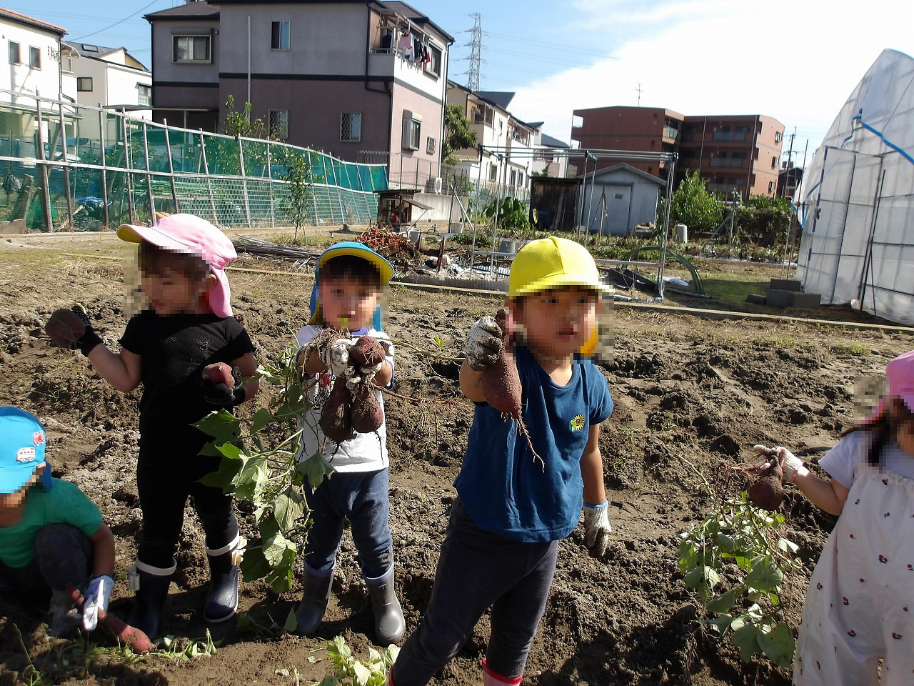 両手で土を掘る子ども達とそれを手伝う先生、芋が見えてくると俄然元気に掘る子ども達と先生達でした(^-^)。しっかり芋が見えたらツルを引っ張ります♪あちこちから「お芋抜けた!」「見てー」等の嬉しい声が聞こえ、満足気な表情の子ども達でした(^-^)。