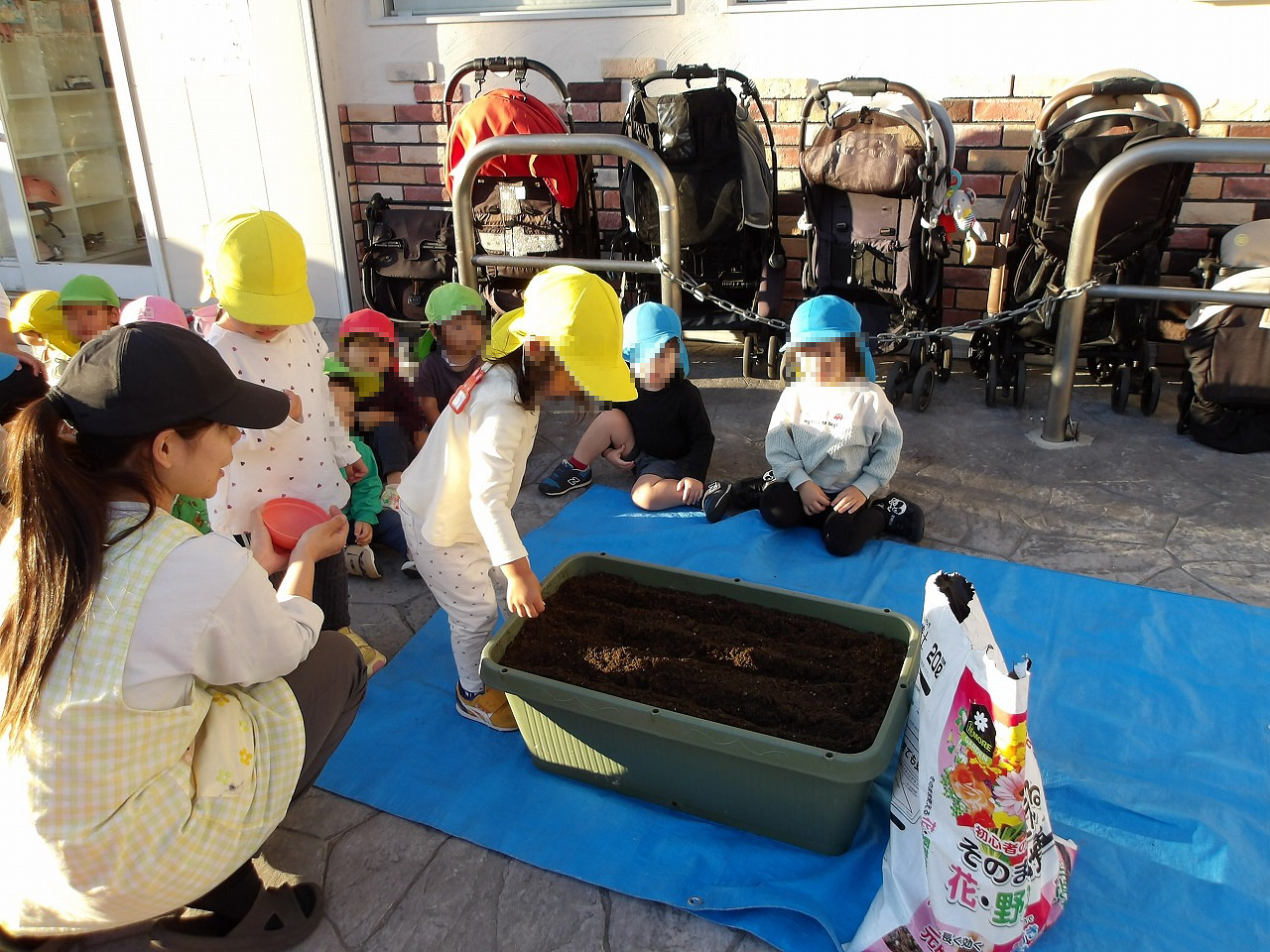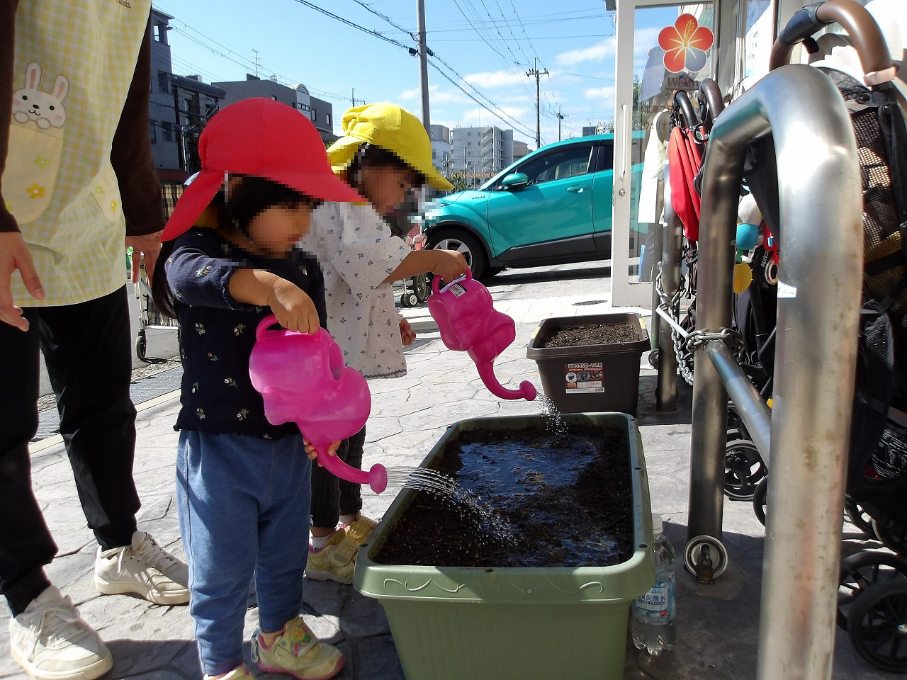 先生から小カブのお話を聞いた子ども達、ゴマより小さい種をつまんでパラパラまいて土をかぶせて水を撒いきました(^-^)。これからお外遊びの後は子ども達が水撒きをします。