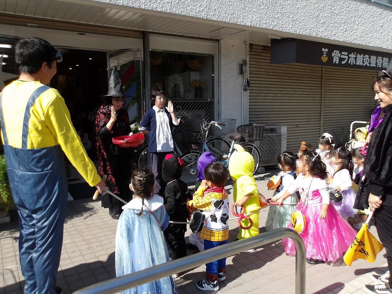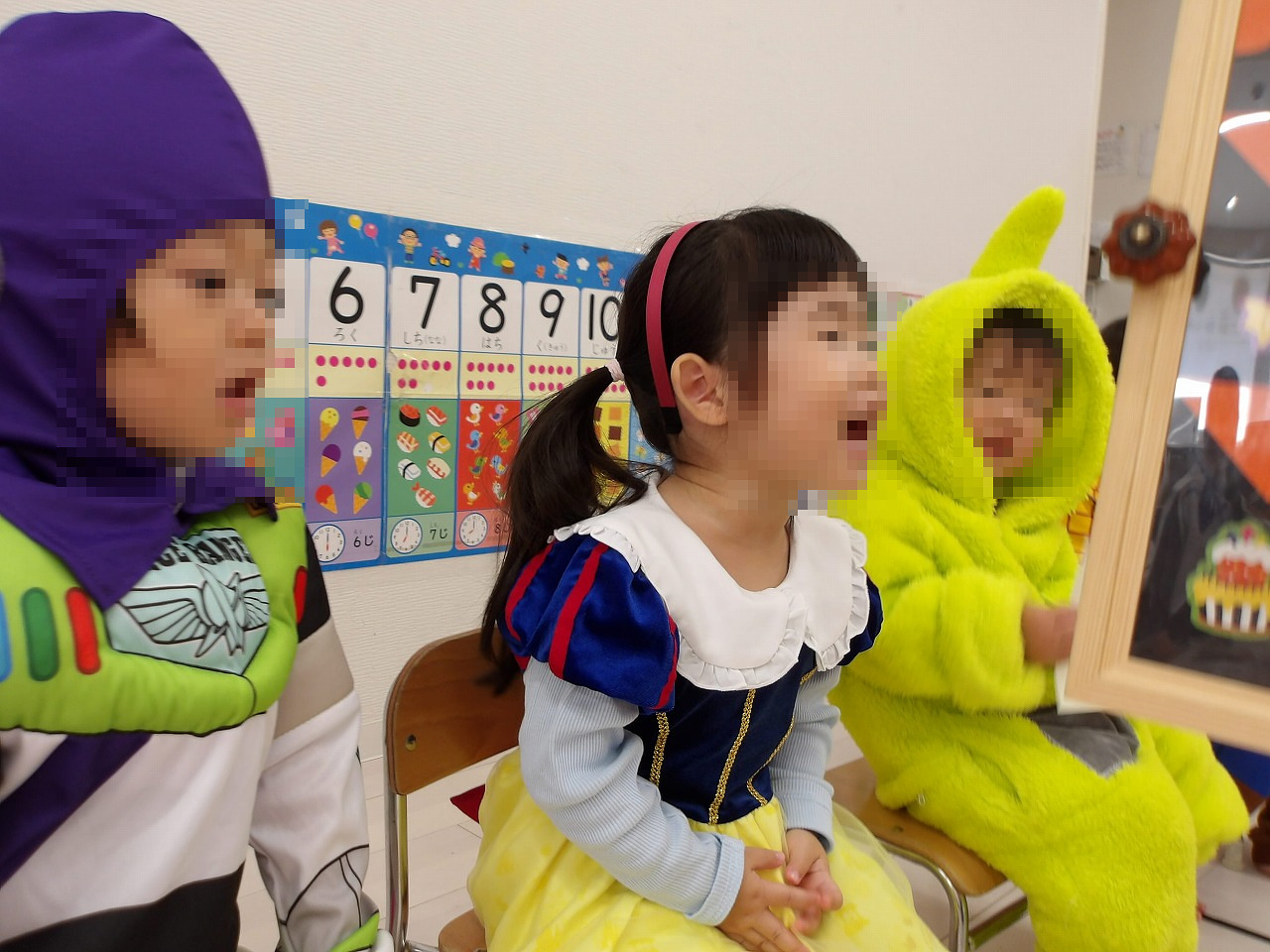 子ども達はみんなで声を合わせ「Trick or Treat!」と大きな声で言えました(^-^)。魔女のお姉さんが「happy Halloween!」とお菓子をくれると、嬉しそうな表情を浮かべる子ども達(^-^)!