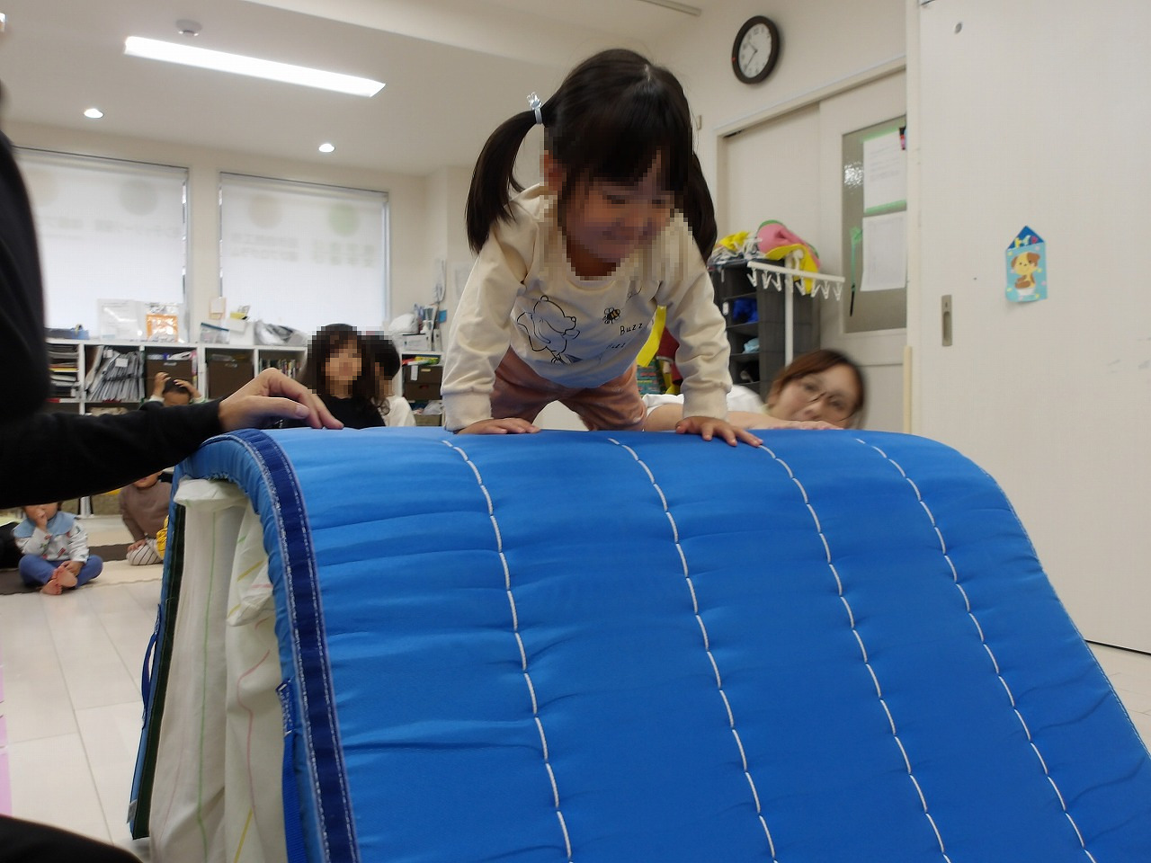 お次はソフトブロック3段の高さを登って降ります。上で体の向きを上手に変えて降りる子や、そのまますべって降りる子も(^-^)。