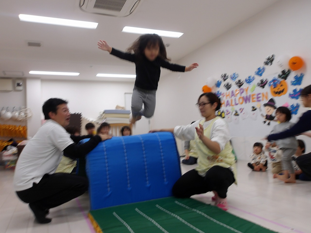 最後は登って上で立ちジャンプでおります。赤組さんは一人でジャンプする子もいました!