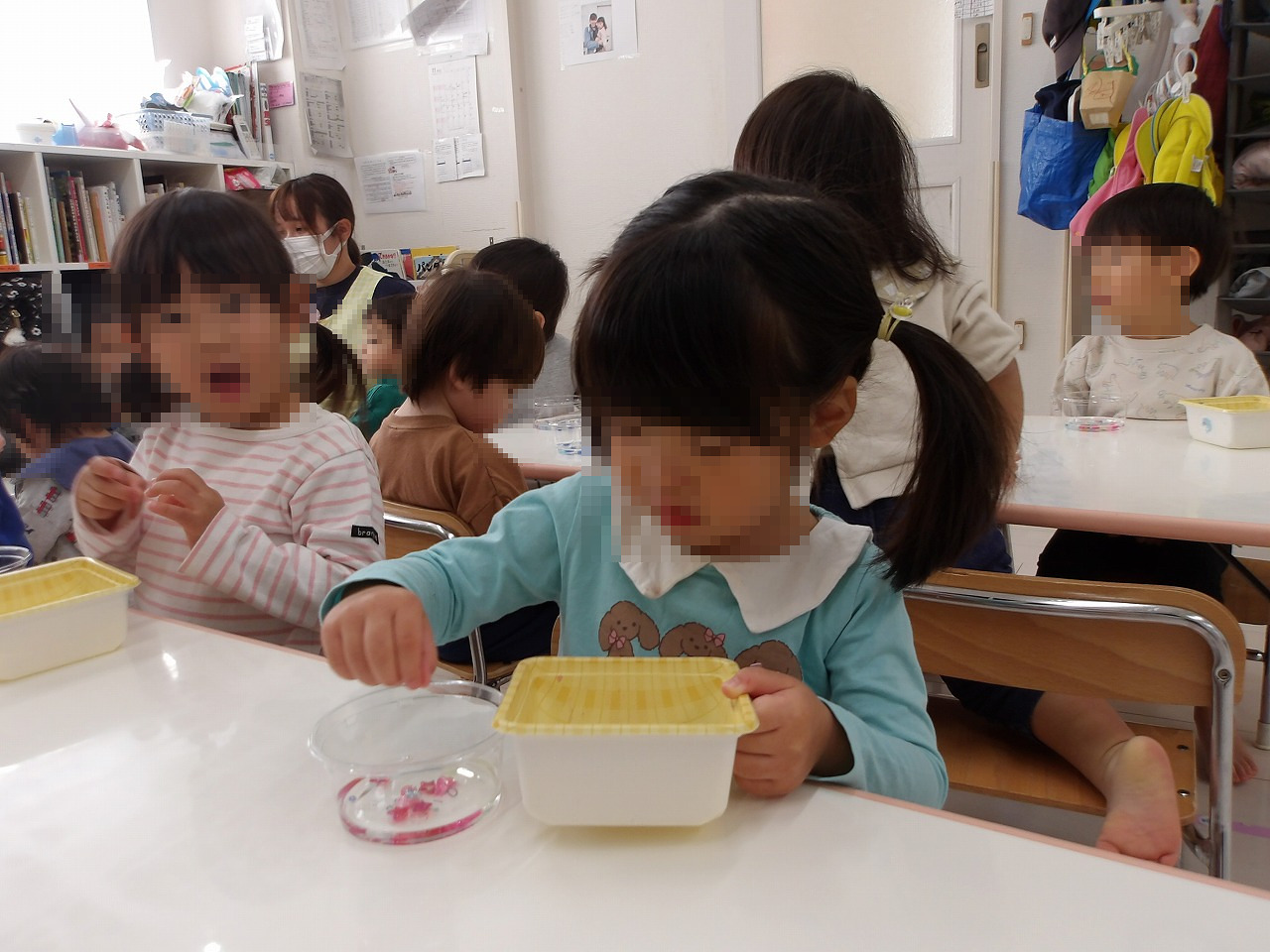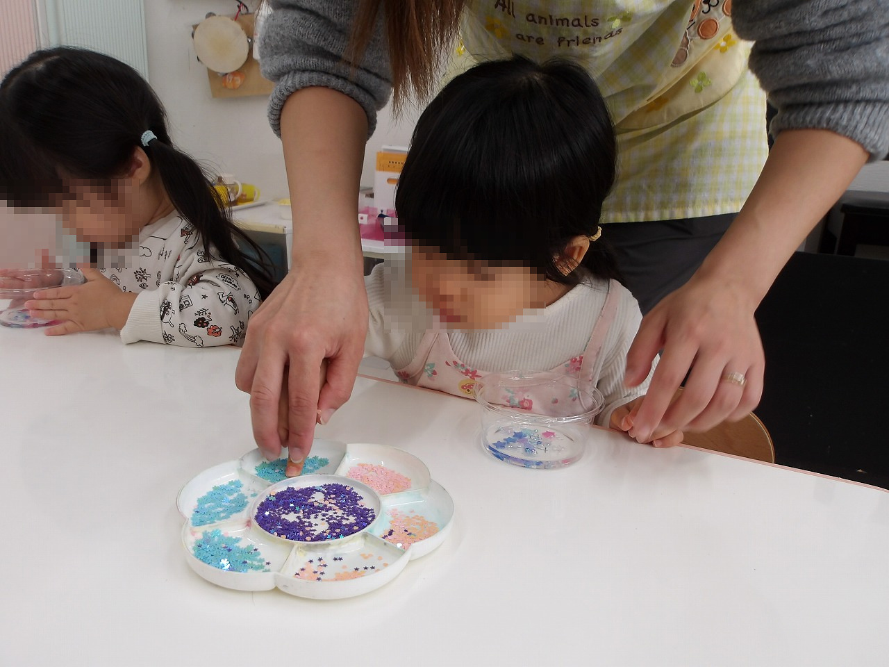 今週もクリスマスツリーを飾るオーナメントを作りました。水のりの入ったカップに自分の好きなビーズやスパンコールをカップに入れて終わり(^-^)!