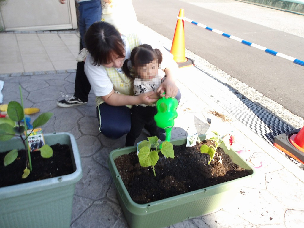 夏野菜(きゅうり、なす、かぼちゃ)の栽培をしました。 子ども達がプランターに石と土を入れ、少し穴を掘り苗を入れ、優しく土をかぶせて水をやりました(^-^)!