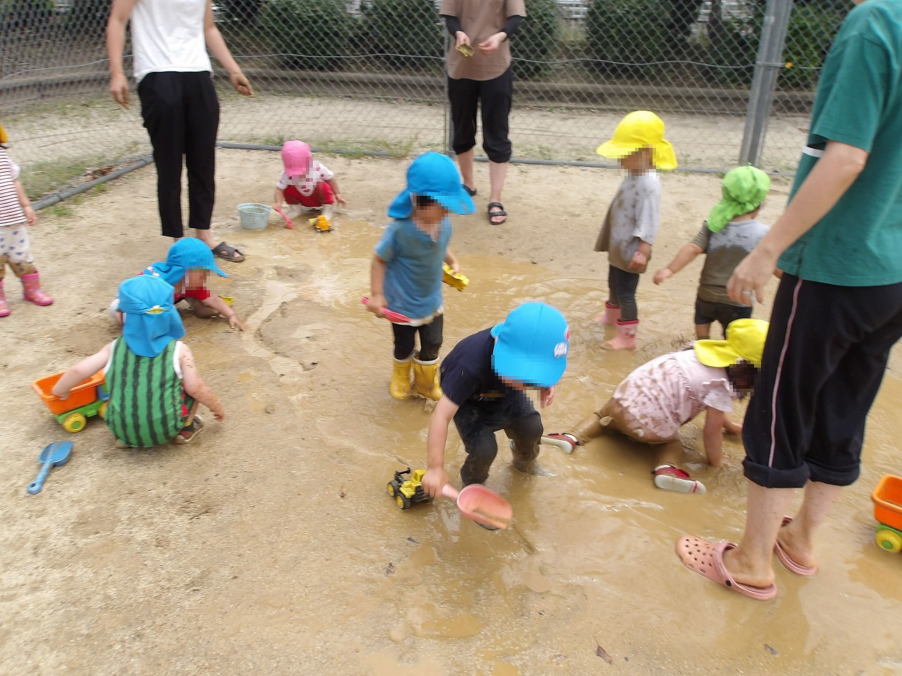 みんなで水たまりに入り、手を泥に入れ感触を楽しんだら泥んこ遊びスタート!