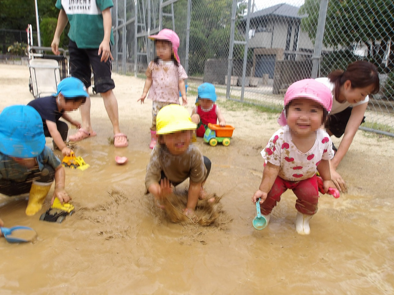 水たまりをピチャピチャと走ったり、手でたたいたりして楽しむ子ども達や、泥のシェイクを作ったり、水鉄砲を楽しむ子ども達も (^-^)。