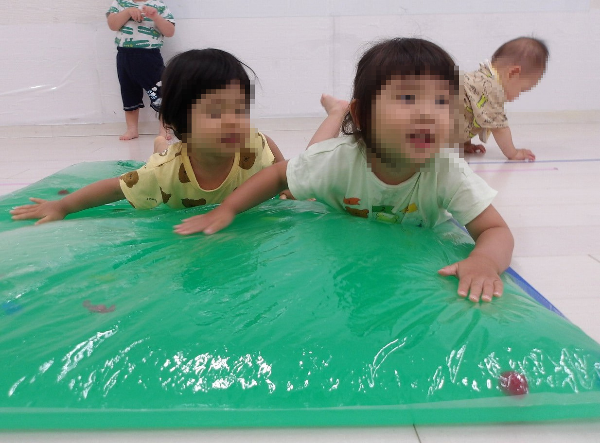 この日は圧縮袋に色水とスポンジの玩具を入れてウォーターベッド遊びをしました。ウォーターベッドの上に寝転び「冷たい!」と浮かんだり、四つん這いになり手で水を押して波を作くったり、先生と「きゅうりができた」を歌い、ふれあい遊びをしました(^-^)!