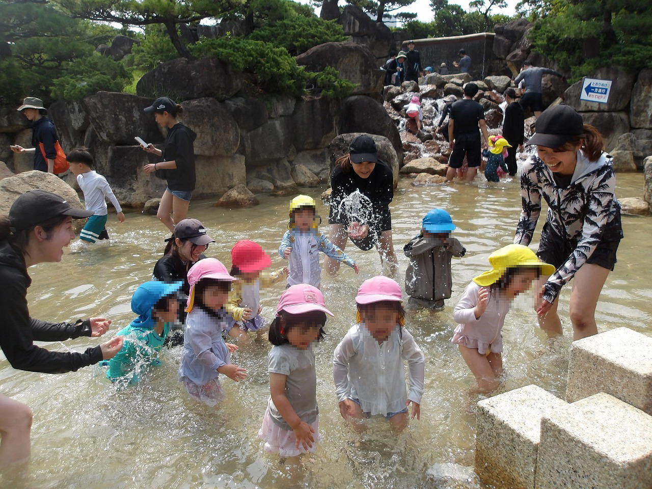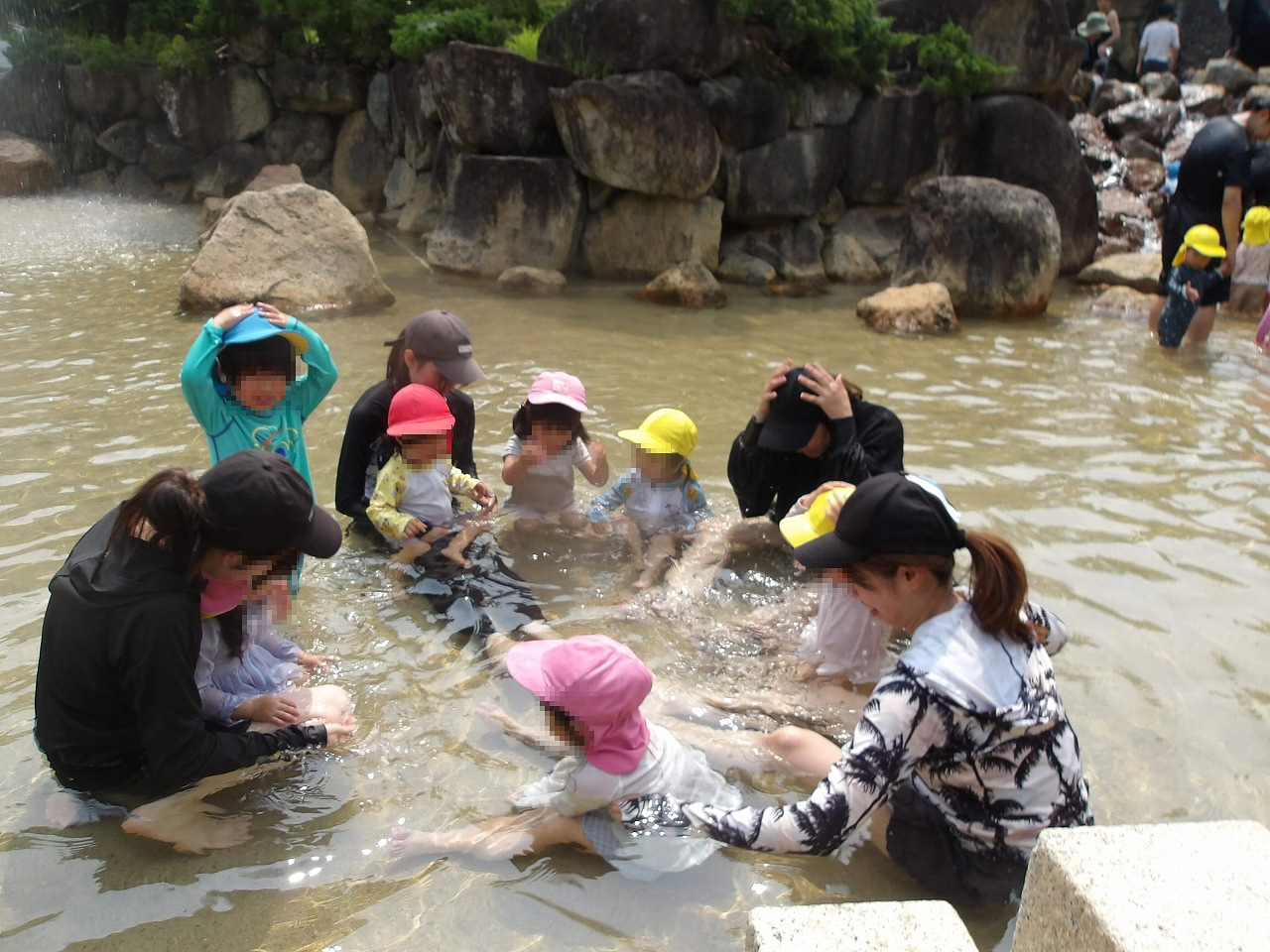 着くと水着に着替えて水遊びスタート!まずは体がびっくりしないように少しずつ水をかけ、みんなで水につかります(^-^)。次は前にいる人へバシャバシャかけたら、みんなで噴水の周りを一周して、滝と岩組ゾーンに向かいます。