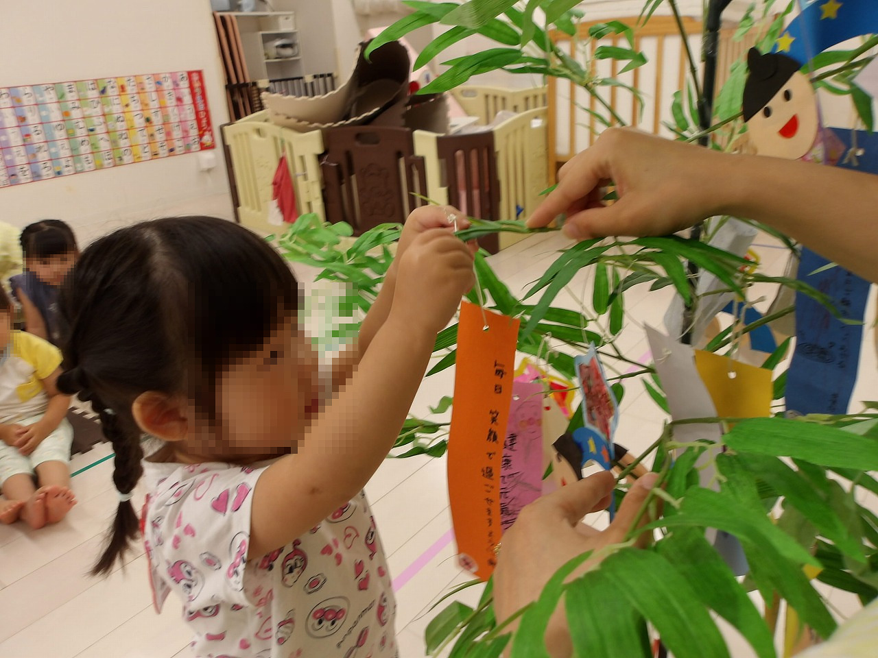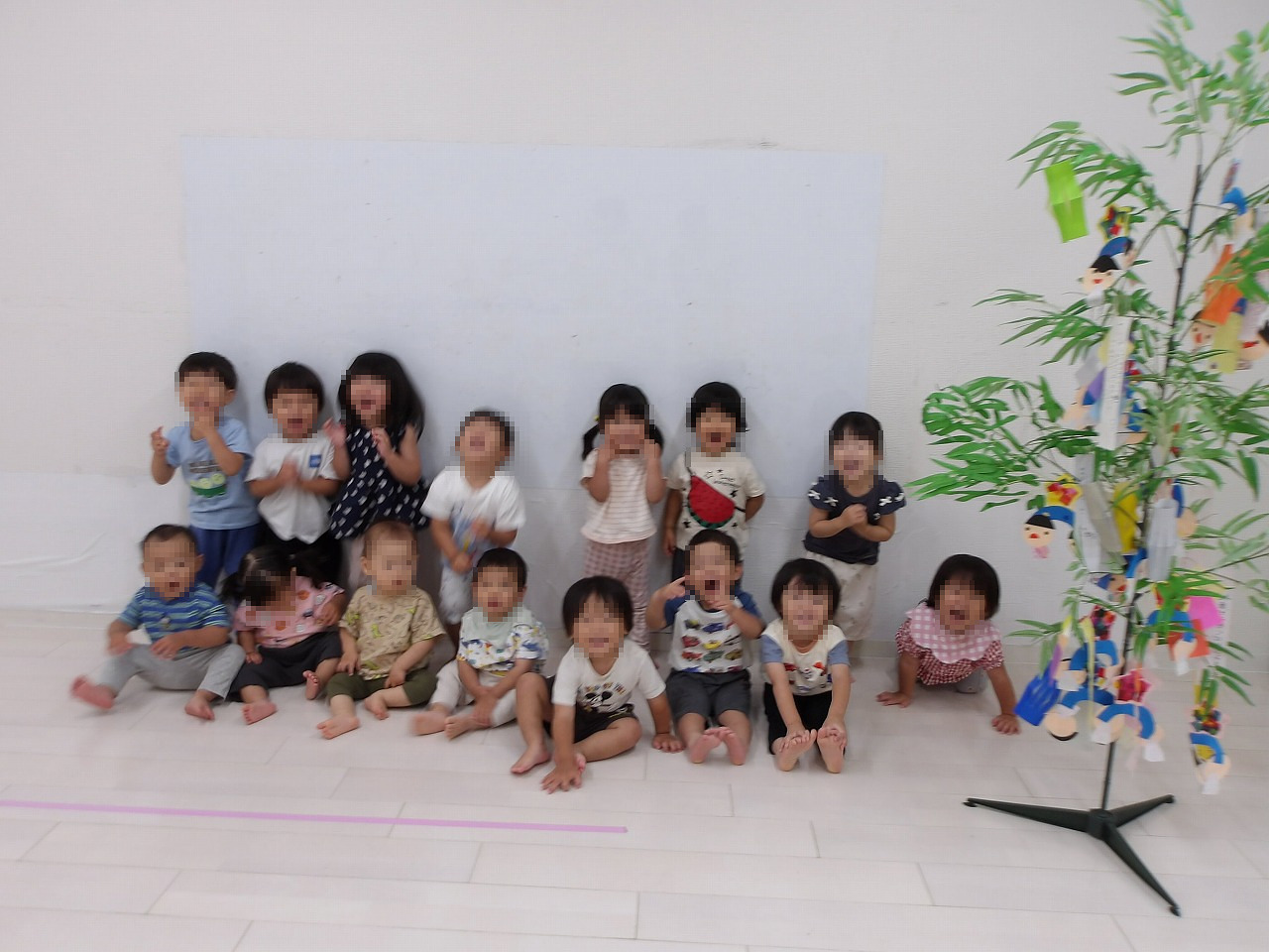 先生から七夕のお話を聞いた後、お部屋を暗くしてプラネタリウム遊びをしました。いろんな色の星を楽しそうに追いかける子ども達でした(^-^)。