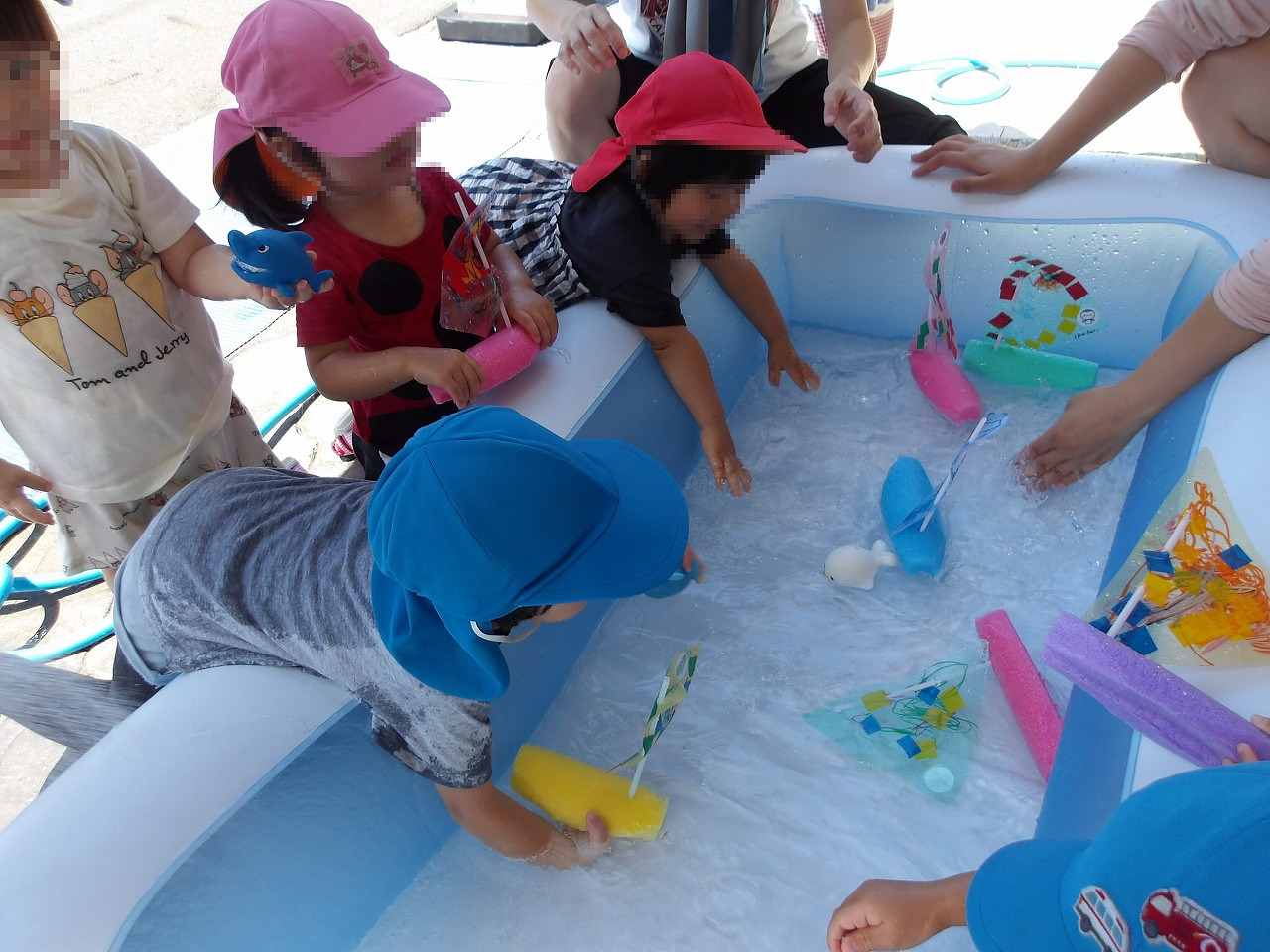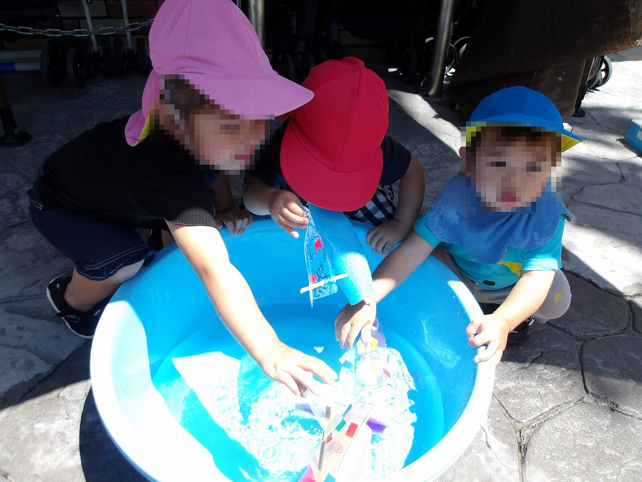 水の入ったプールとタライにお舟を浮かべて遊んだ子ども達、いつの間にか水鉄砲や魚の玩具等も入れて、水遊びを楽しむ子ども達でした(^-^)。