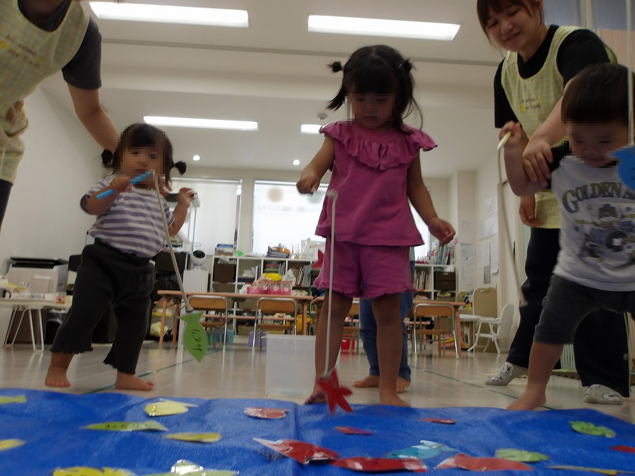 「あか」「あお」「き」「みどり」と書いている所へ、釣った魚の色を見て持って行く遊びです。最後は2チームに分かれ、どちらがたくさん釣れるか?競争しました(^-^)。