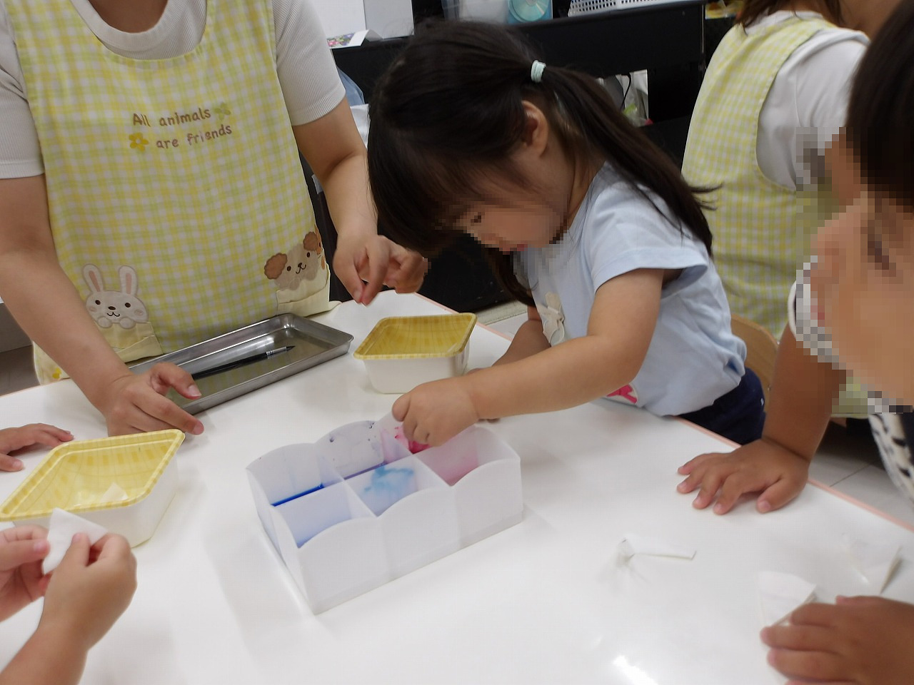 今週はアサガオを作りました。 折っている天ぷらシートを赤組(2歳児)さんはハサミでチョキチョキお花の形に切ります。切った天ぷらシートを好きな色の絵の具につけるとアサガオの出来上がり、お次は模造紙にクレヨンでカキカキしてツルを描いたら完成です(^-^)。