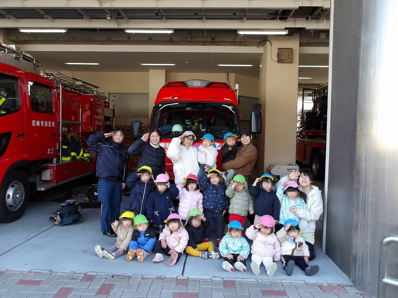 この日は尼崎北消防署へ消防車の見学に行きました(^-^)。消防士の優しいお姉さんから消防車の説明を聞いた子ども達、最後はお姉さんに敬礼の仕方を教わり、みんなで記念撮影「敬礼!」。