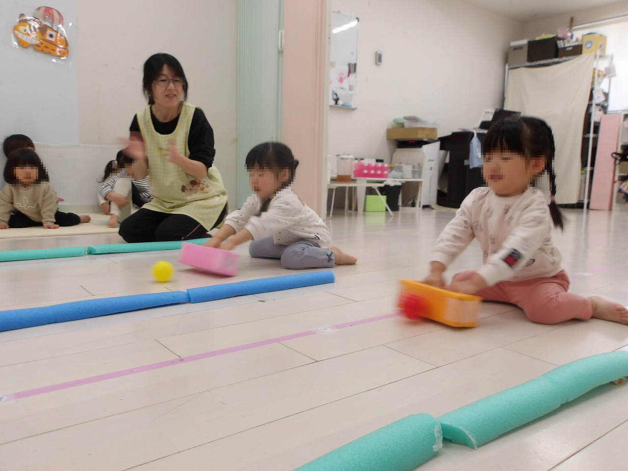 この日はエアホッケーゲームとバランスゲームをして遊びました。 お互い向きあって座り、牛乳パックでボールを相手に向かって押します。相手が押し返せなかったら勝ちです。