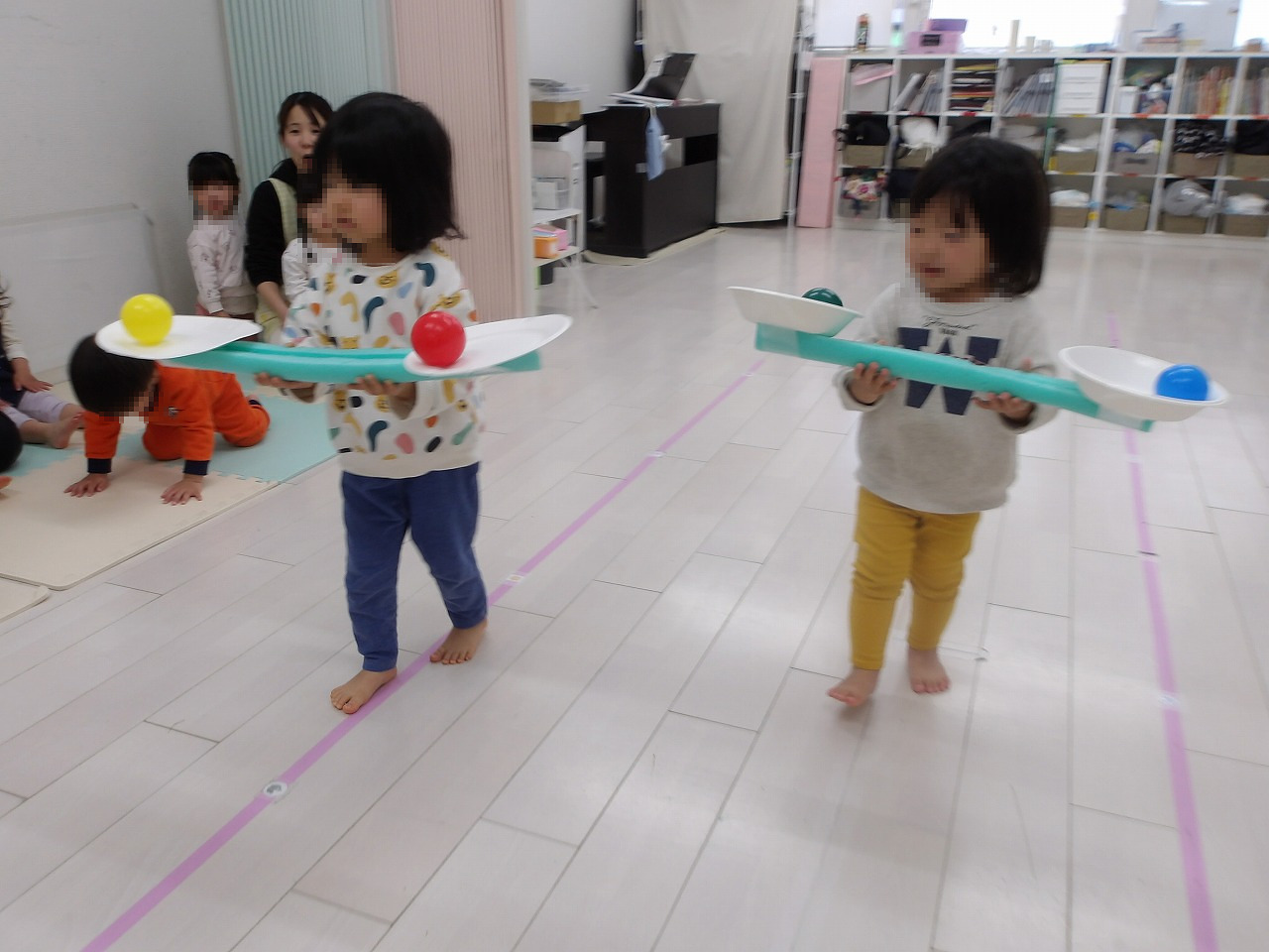 そのあとはバランスゲームをしました。プールスティックの両端の紙皿にボールを置き、落とさないように運びます。 みんな〜、がんばれ〜