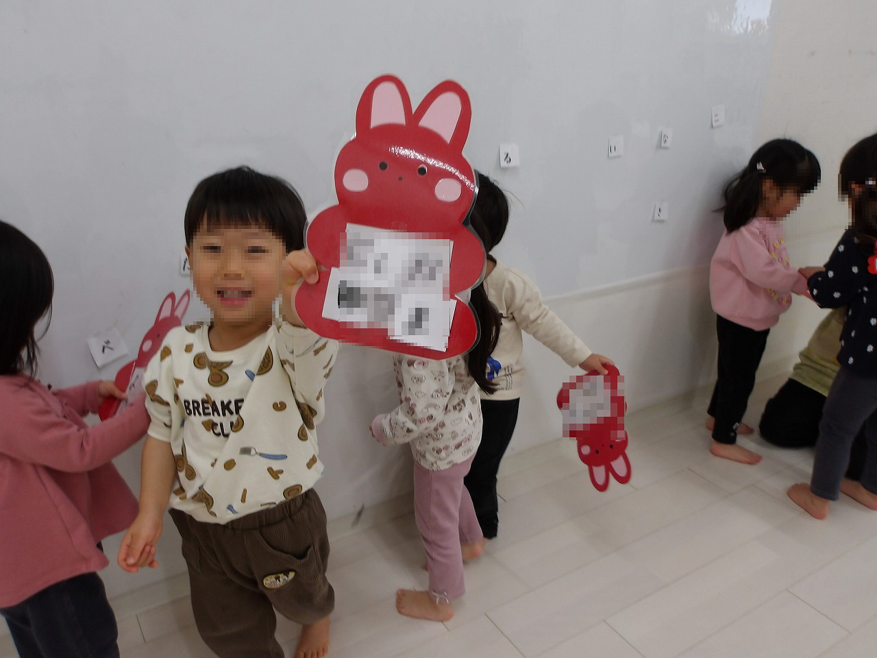 令和7年度保育最後の文字遊びプログラムは、赤組(2歳児)さんは自分の名前の穴埋め、黄・オレンジ組(0.1歳児))さんは文字合わせをしました(^-^)。 足りない文字を探し、自分の名札を完成させる赤組さん流石です!