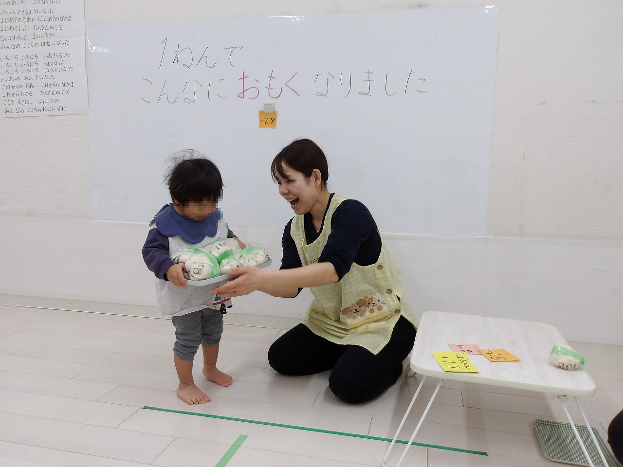 数字遊びプログラムは去年の4月から3月までにどれくらい大きく成長したか比べてみました。身長では4月の自分と今の自分を比べ、体重は増えた分のお米を持ってみました。 みんな大きくなりましたね!