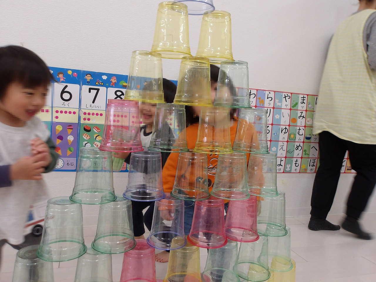 今週はコップブロック・シーツ遊びました。先生からコップブロックの遊び方を聞いてスタート!上手にコップ積み上げる赤組(2歳児)さん、積みあがったコップを見て満足げな表情を浮かべます(笑)。新入園児さんも泣くのをやめてコップに興味津々 (^-^)!