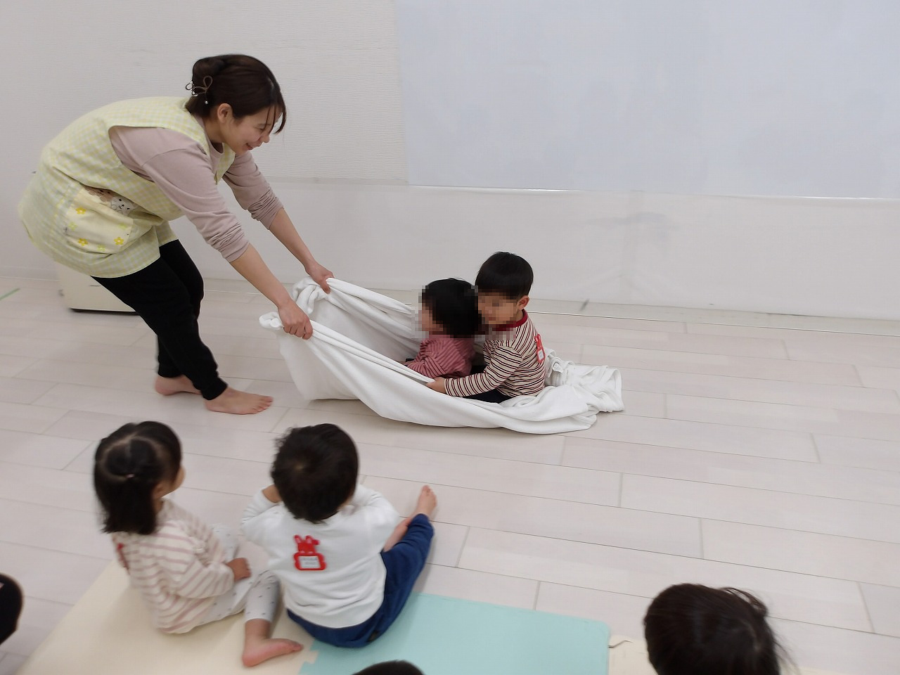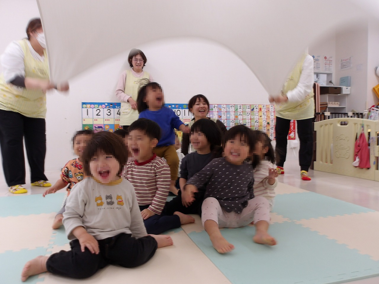 シーツ遊びでは電車やハンモックごっこなどを楽しみました(^-^)。