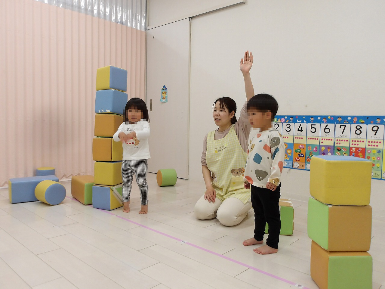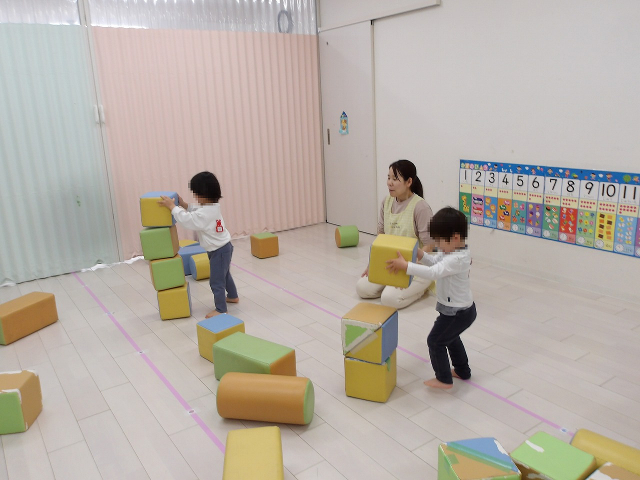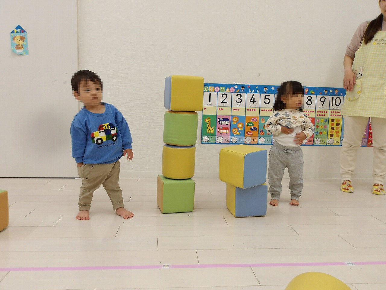 今週から数字プログラムがはじまりました。はじめは先生がソフトブロックを使い、どっちが高いか、どっちが低いかの説明をします。説明が終わると、二人ずつ前に出て競争、ソフトブロックを高く積めた方が勝ちです (^-^)。