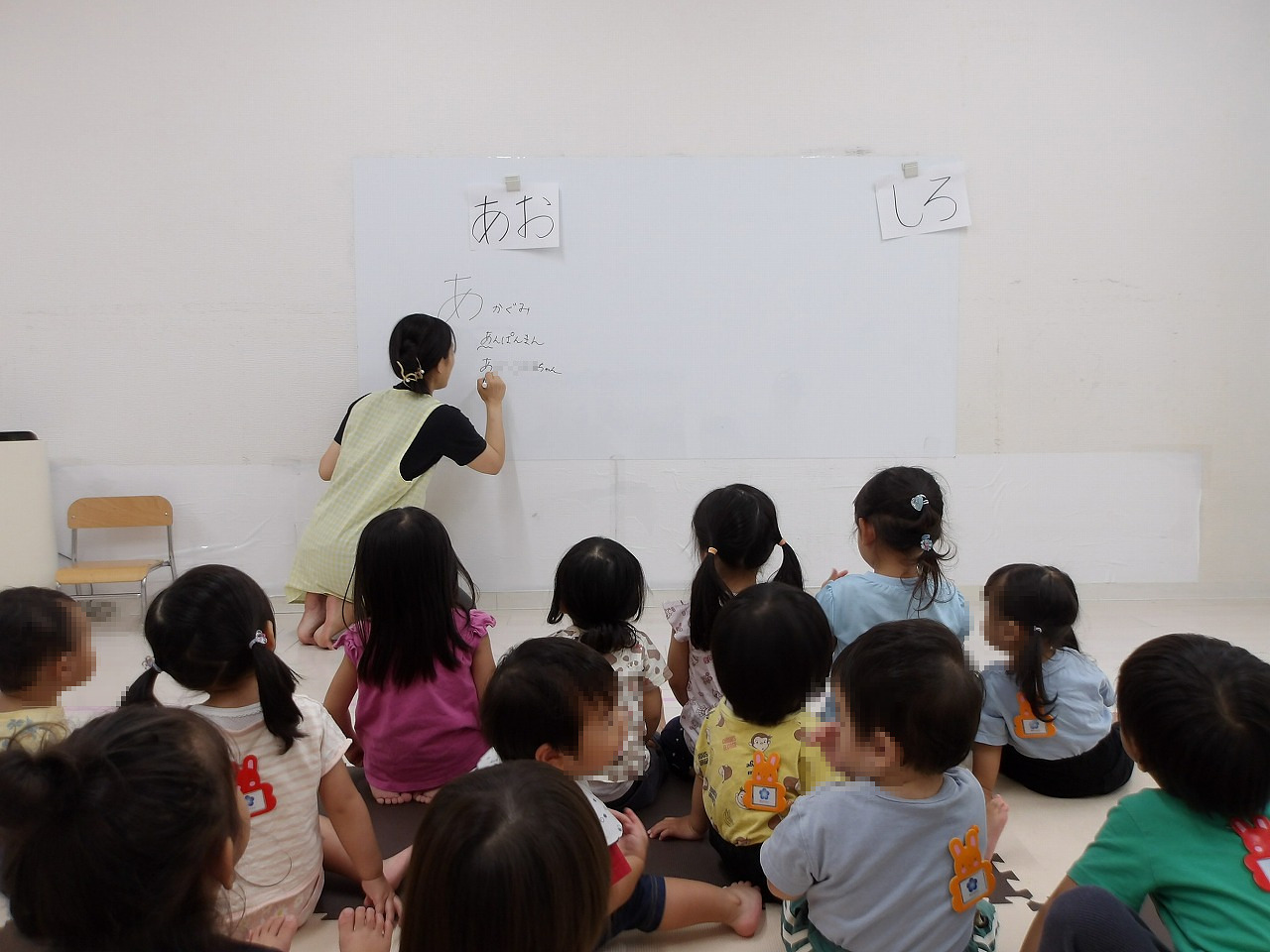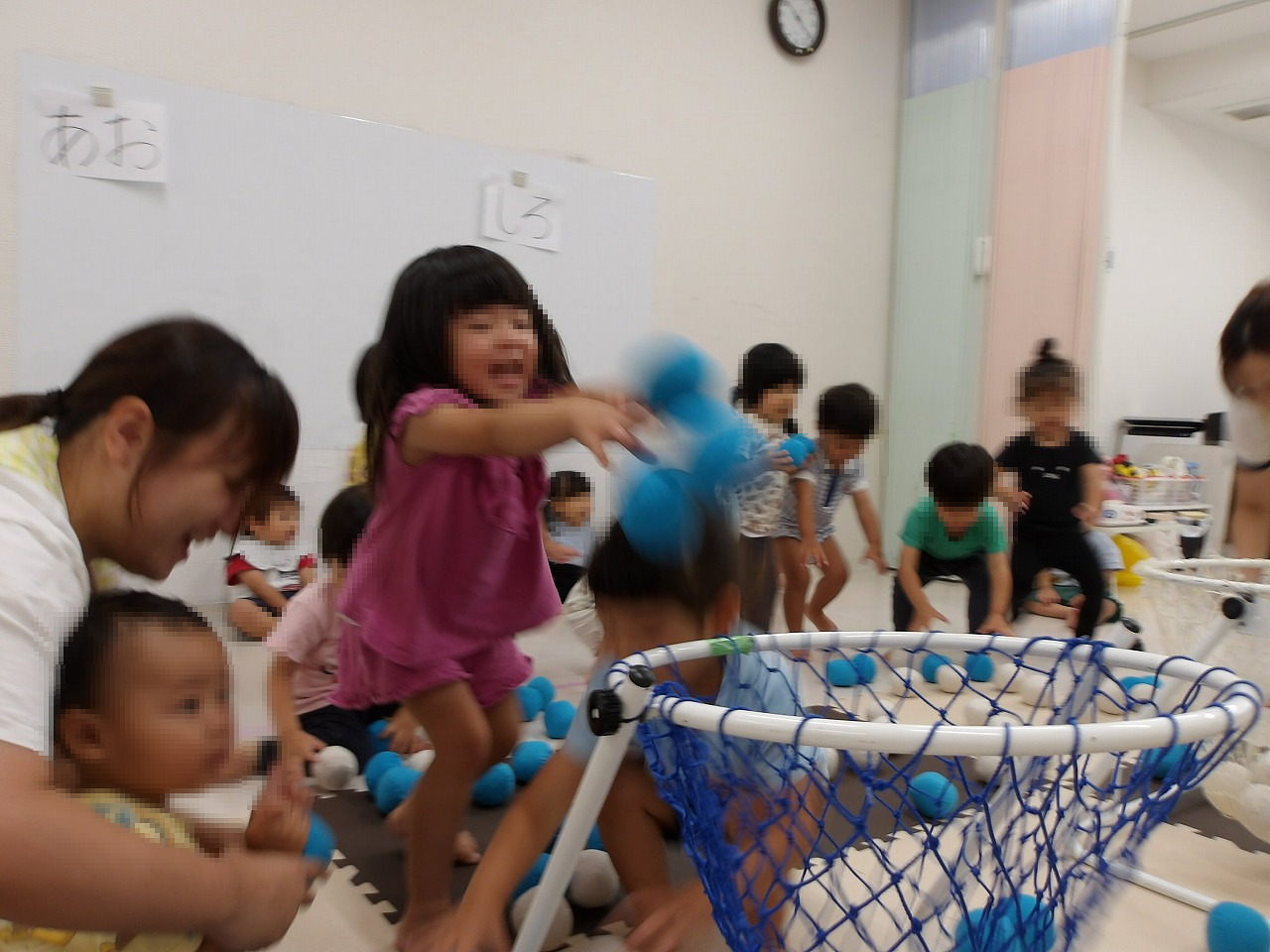 「あお」の「あ」のつく言葉知っている?「あかぐみ!」「アンパンマン!」や「あ〇 〇〇〇ちゃん!」など上手に答える子ども達、最後は青チーム(子ども達)と白チーム(先生)に分かれて玉入れ対決をしました(^-^)。