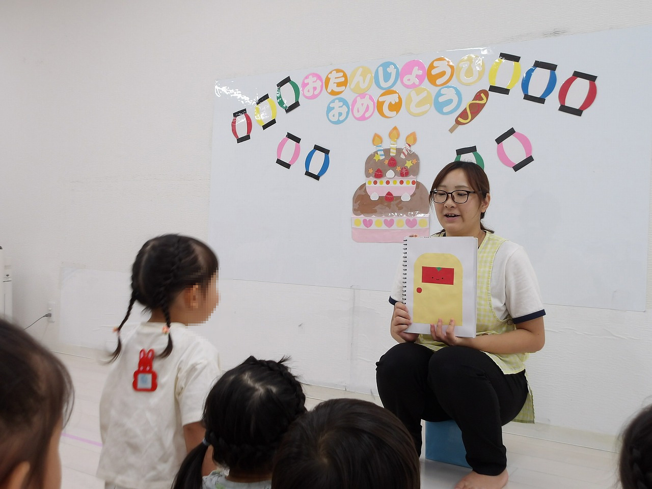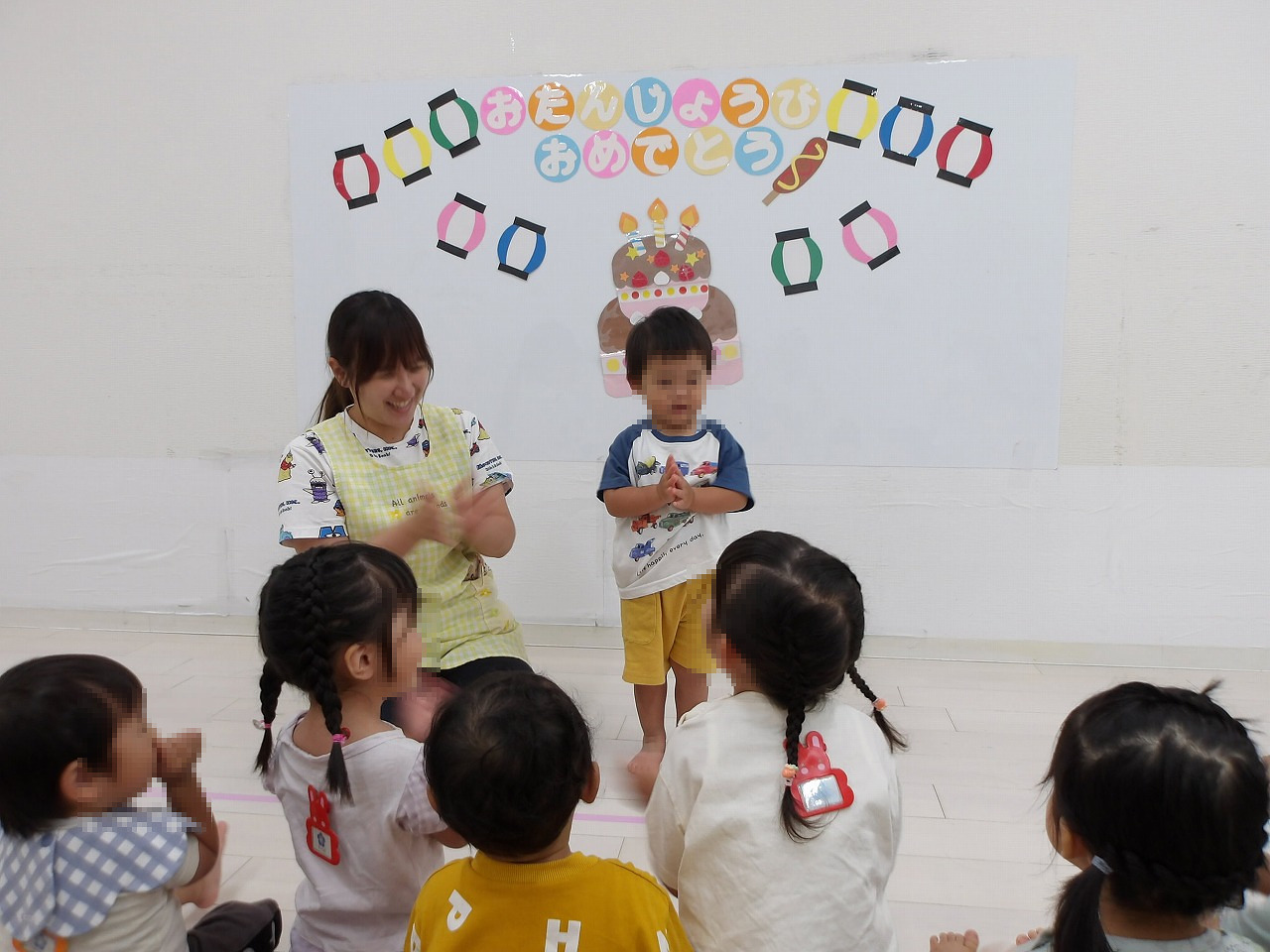 調理師さんの手作りケーキと牛乳で「カンパーイ!」した後は、先生からのプレゼントとお友達からのお歌のプレゼントをもらいすこし照れながらも嬉しそうなSくん(^-^)。