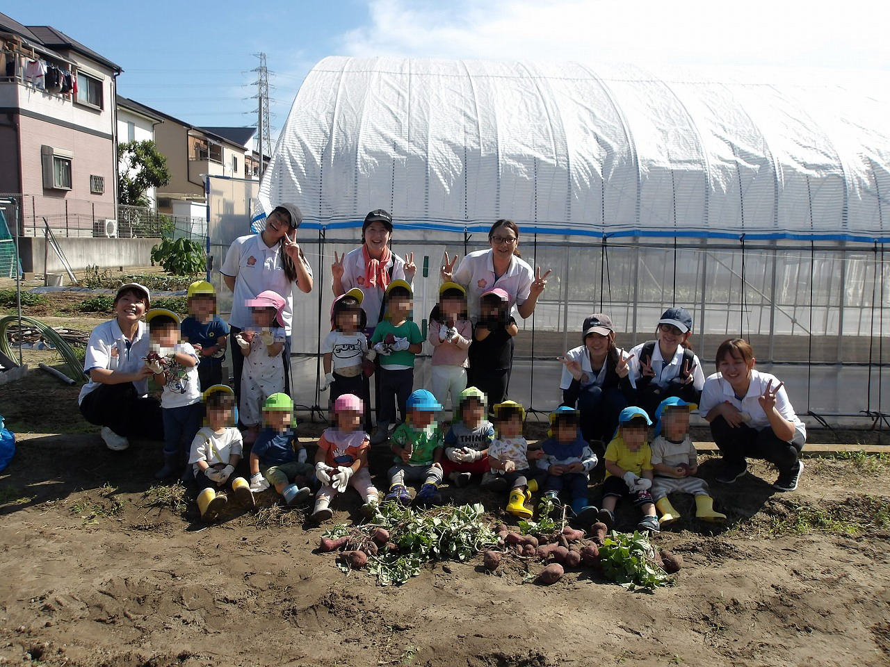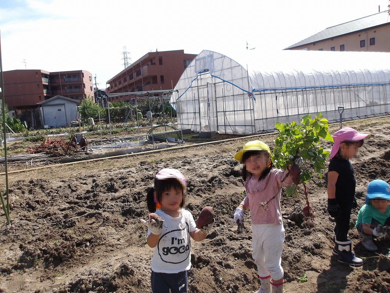 両手で土を掘る子ども達とそれを手伝う先生、芋が見えてくると俄然元気に掘る子ども達と先生達でした(^-^)。しっかり芋が見えたらツルを引っ張ります♪あちこちから「お芋抜けた!」「見てー」等の嬉しい声が聞こえ、満足気な表情の子ども達でした(^-^)。