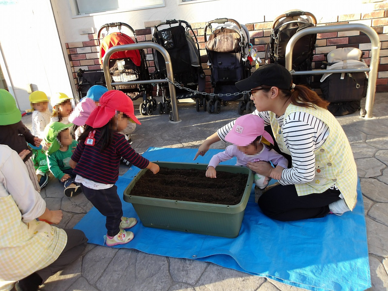 先生から小カブのお話を聞いた子ども達、ゴマより小さい種をつまんでパラパラまいて土をかぶせて水を撒いきました(^-^)。これからお外遊びの後は子ども達が水撒きをします。