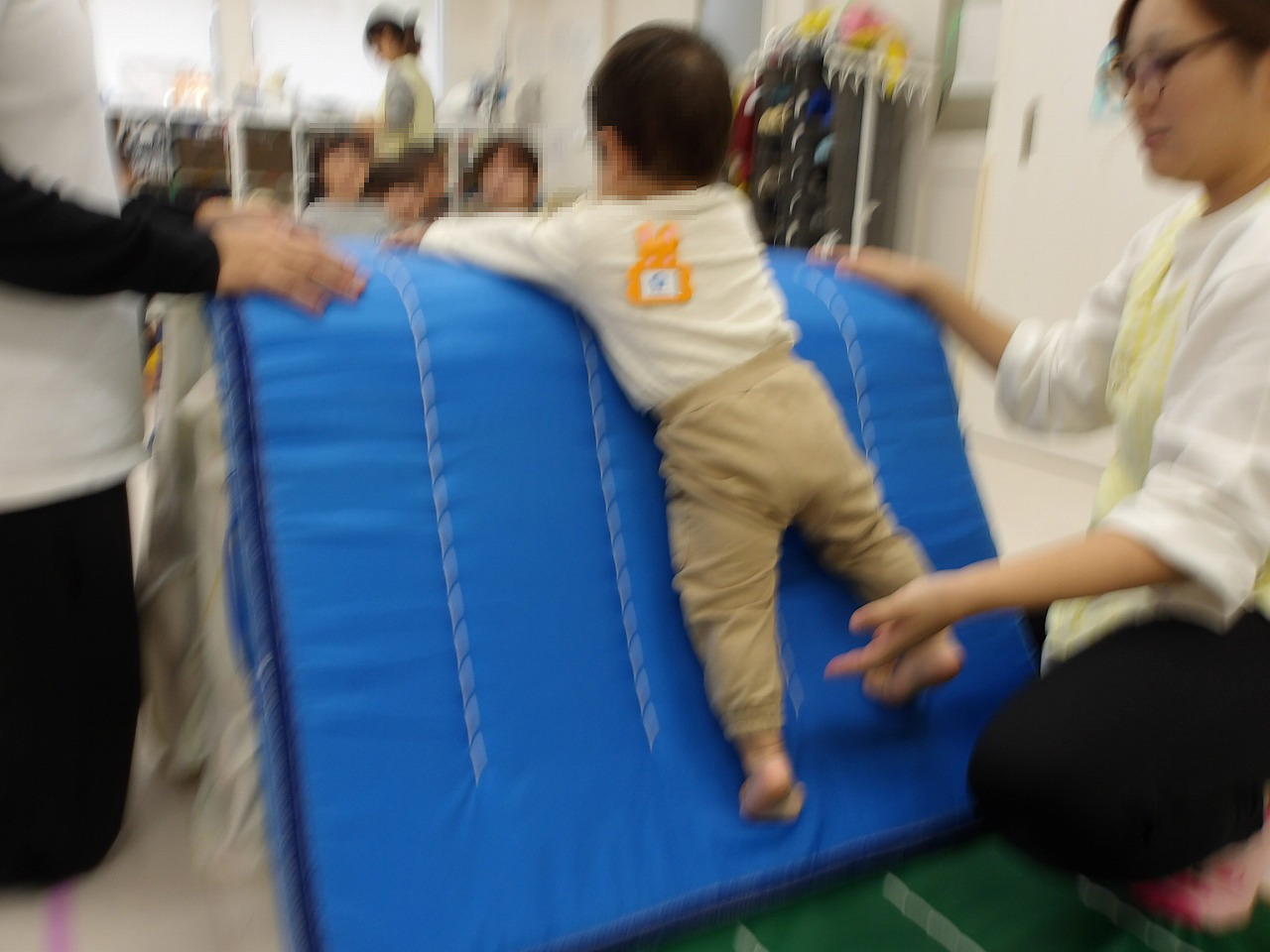 お次はソフトブロック3段の高さを登って降ります。上で体の向きを上手に変えて降りる子や、そのまますべって降りる子も(^-^)。