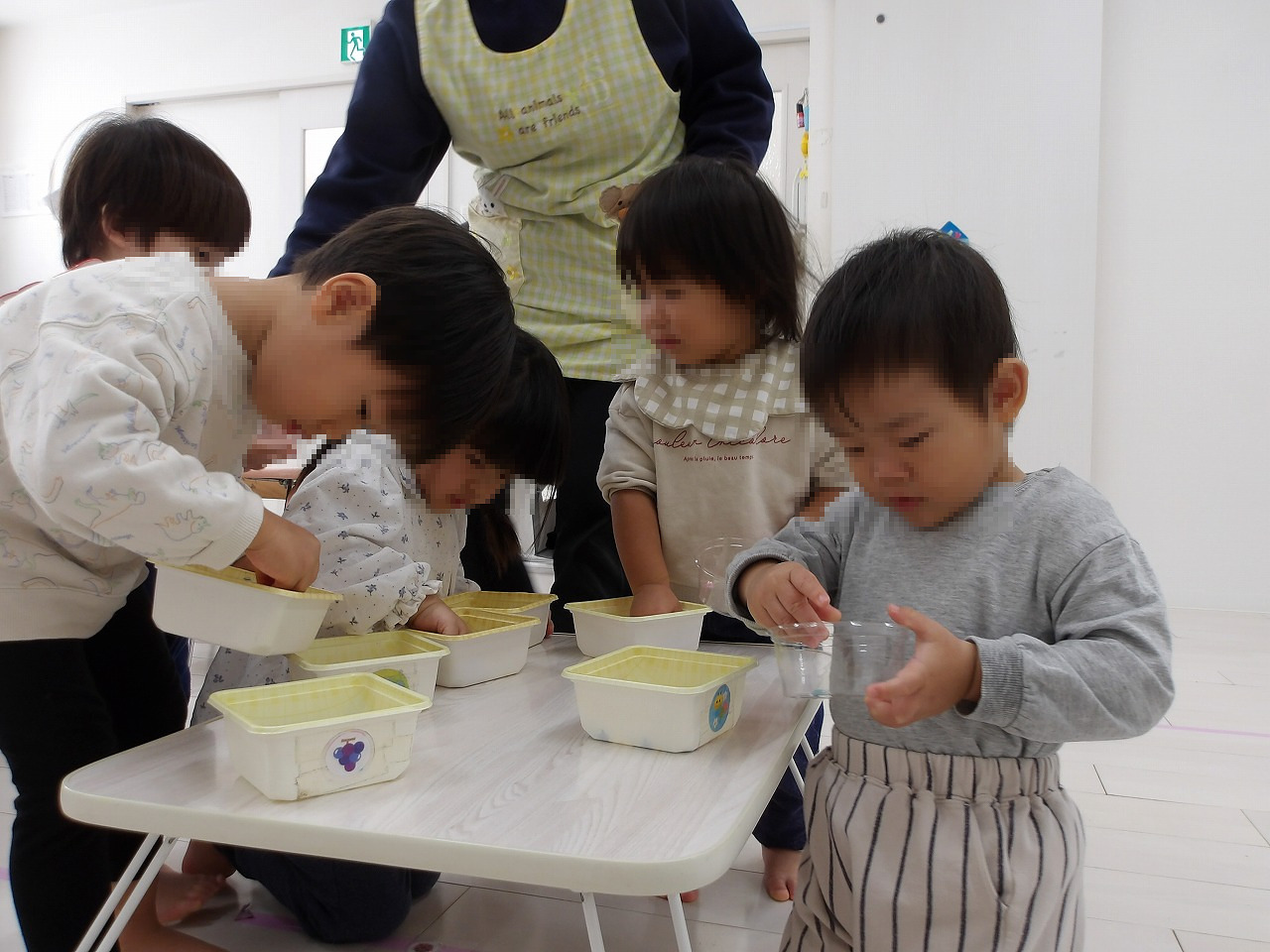 今週もクリスマスツリーを飾るオーナメントを作りました。水のりの入ったカップに自分の好きなビーズやスパンコールをカップに入れて終わり(^-^)!
