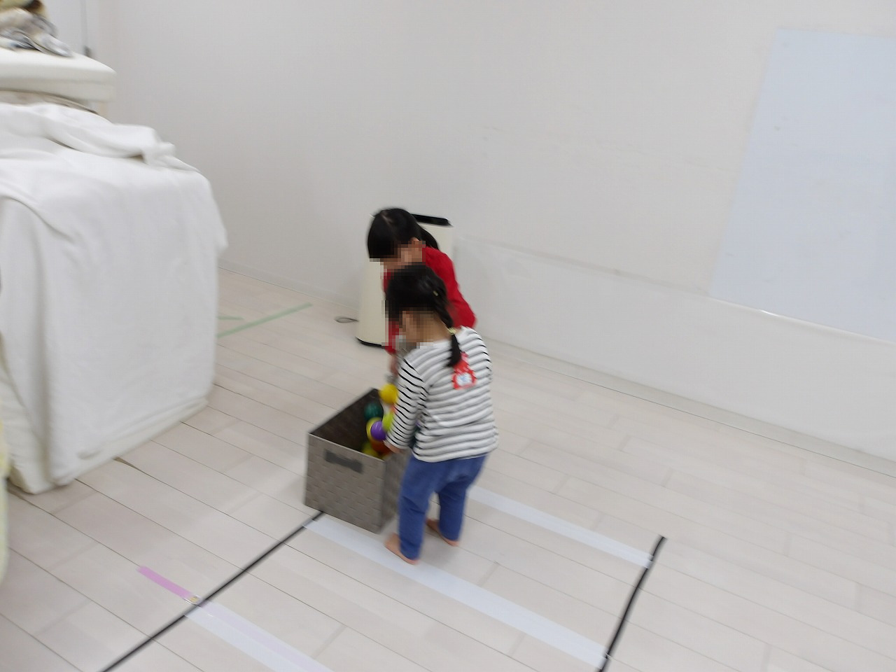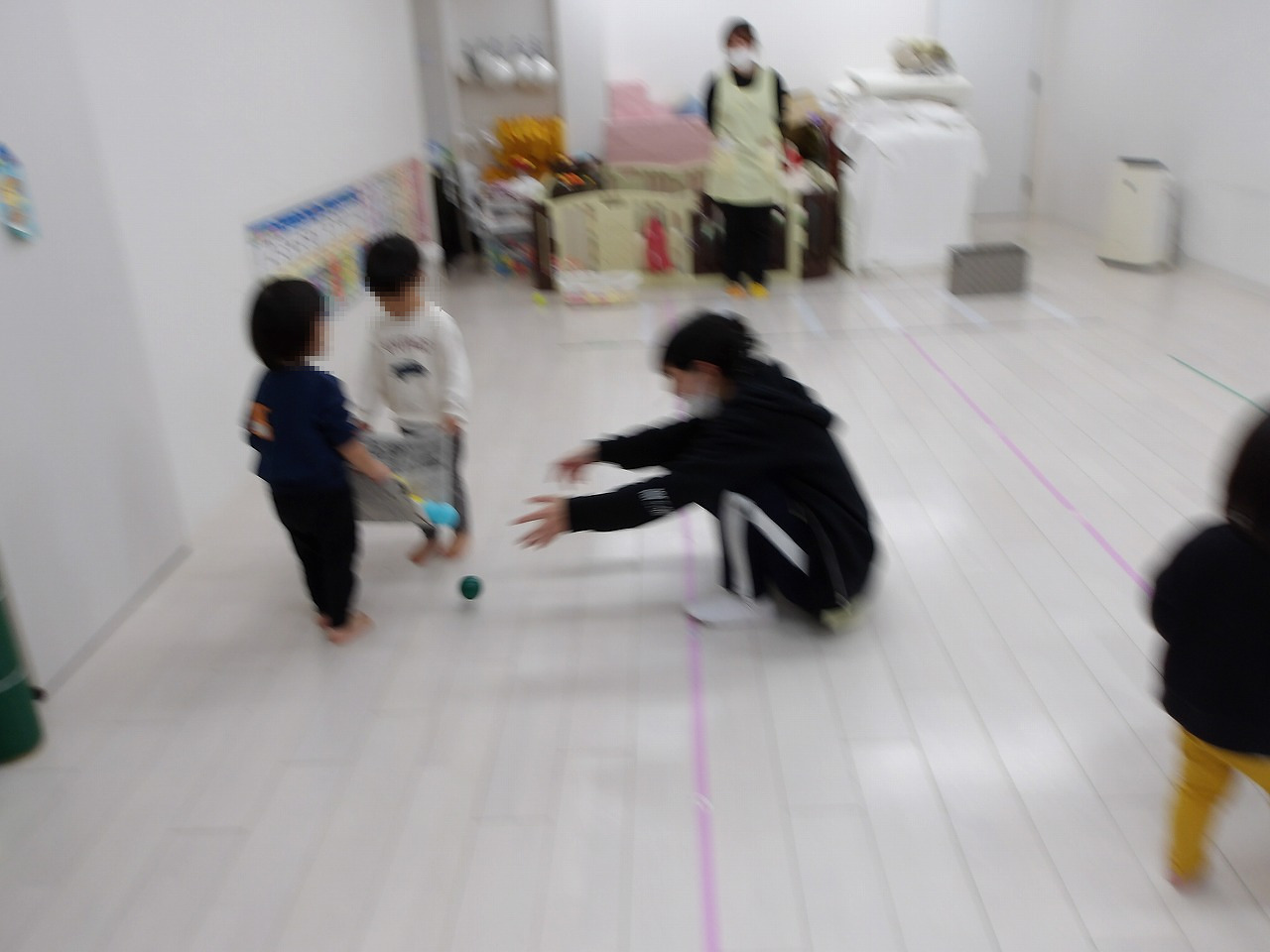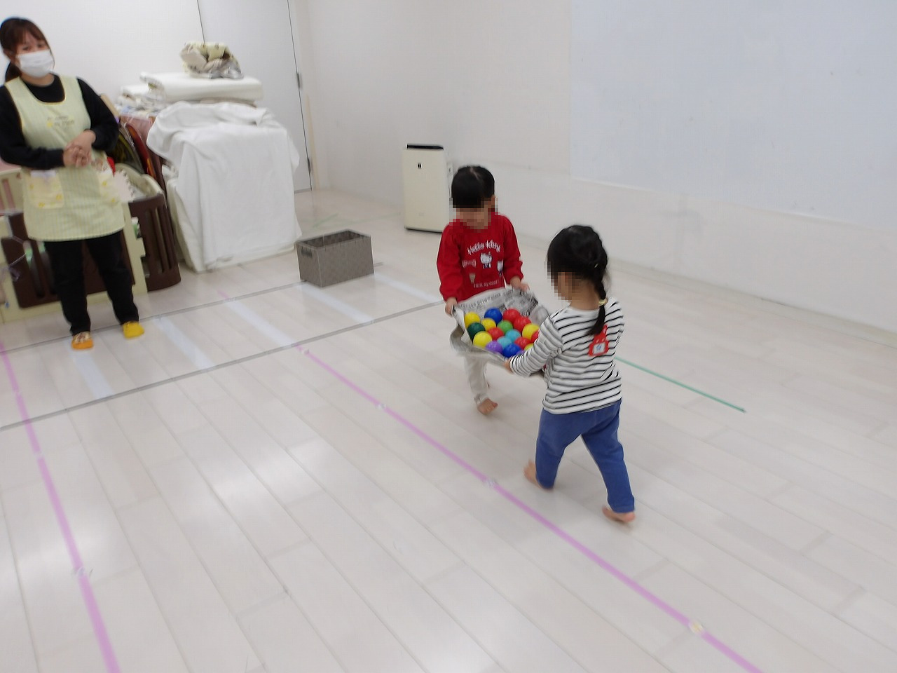 沢山ボールを運んだチームが勝ちです。ボールから目を離すとボールが落っこちゃうよー!回数を重ねるたびに上手くなる子ども達でした(^-^)!