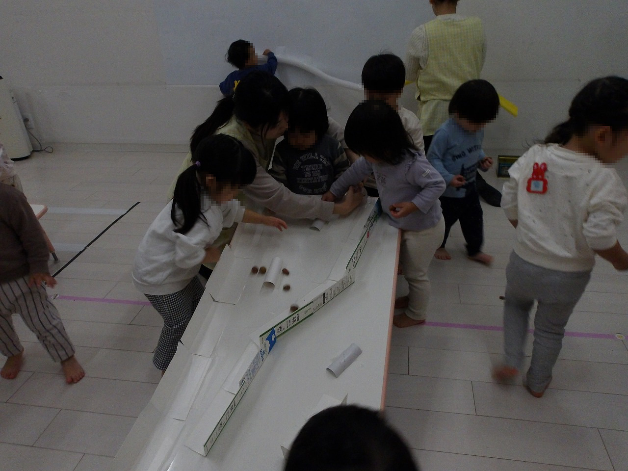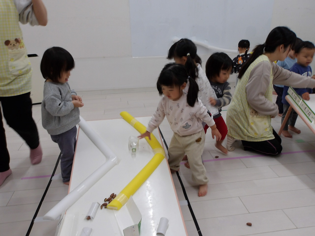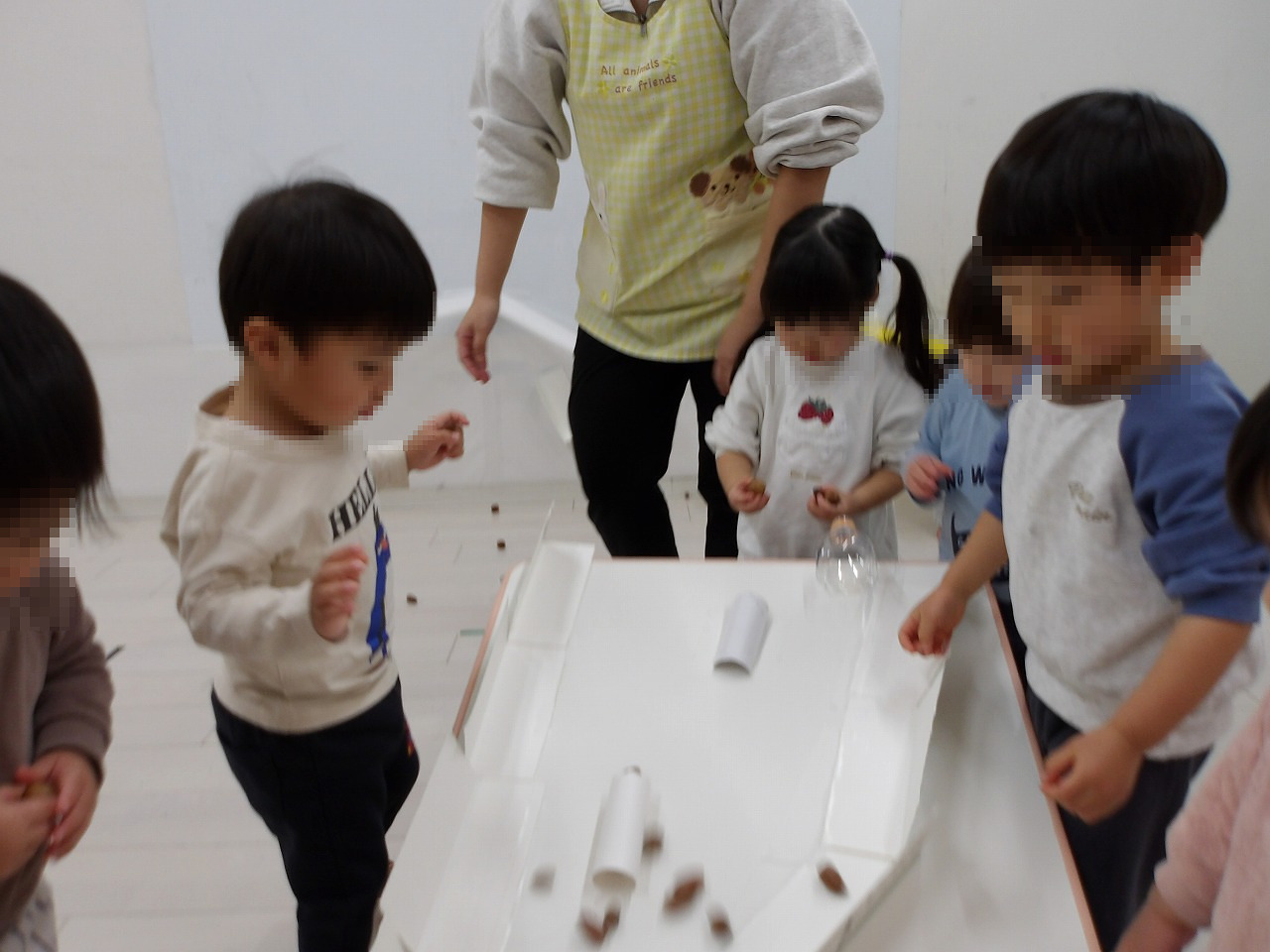 この日はドングリ転がしをして遊びました。丸いドングリや細長いドングリをコロコロ転がして遊ぶ子ども達、途中からたくさんのドングリをいっきに転がして遊ぶなど、ダイナミックに遊んだ子ども達でした (^-^)。