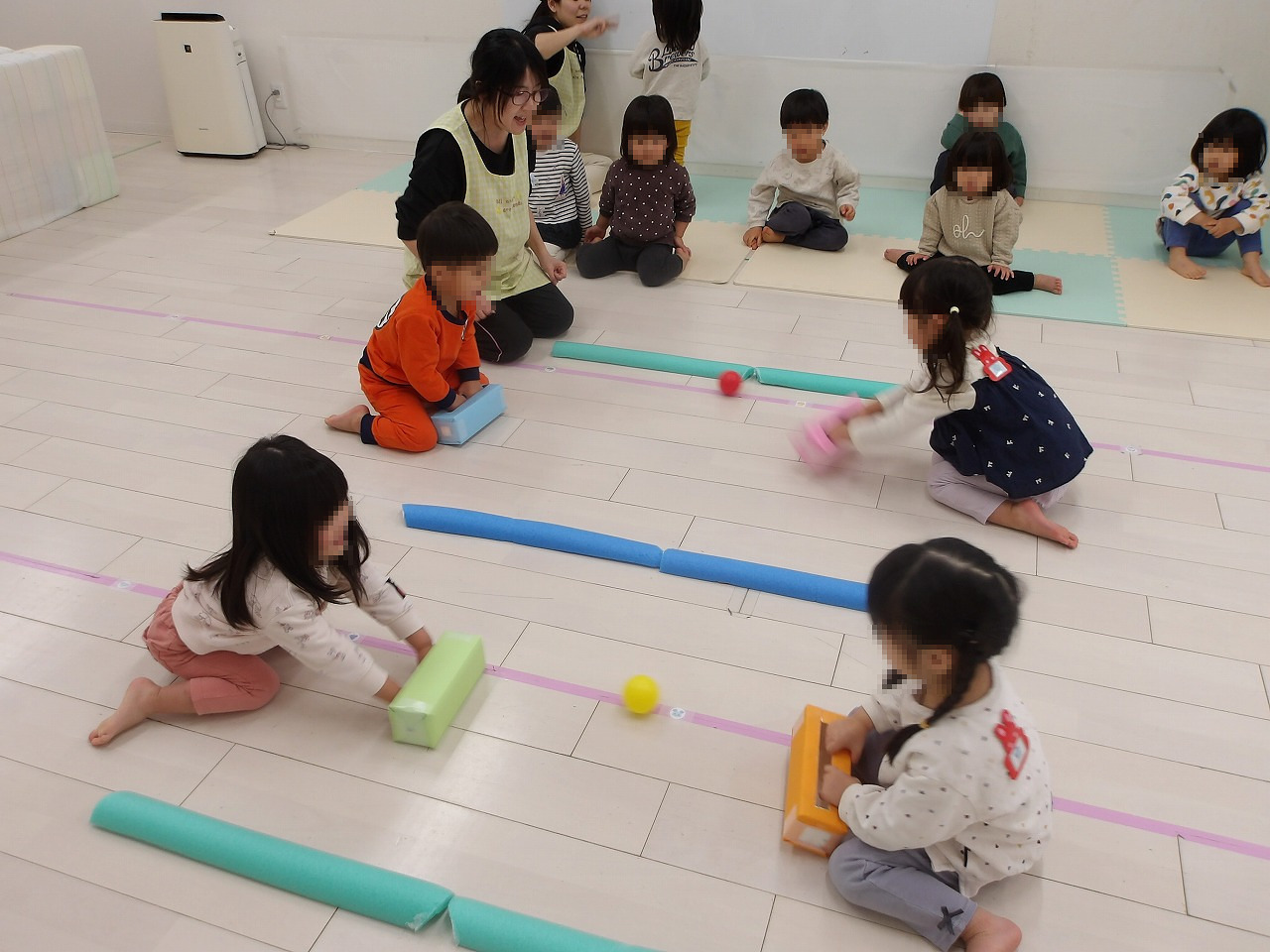 この日はエアホッケーゲームとバランスゲームをして遊びました。 お互い向きあって座り、牛乳パックでボールを相手に向かって押します。相手が押し返せなかったら勝ちです。