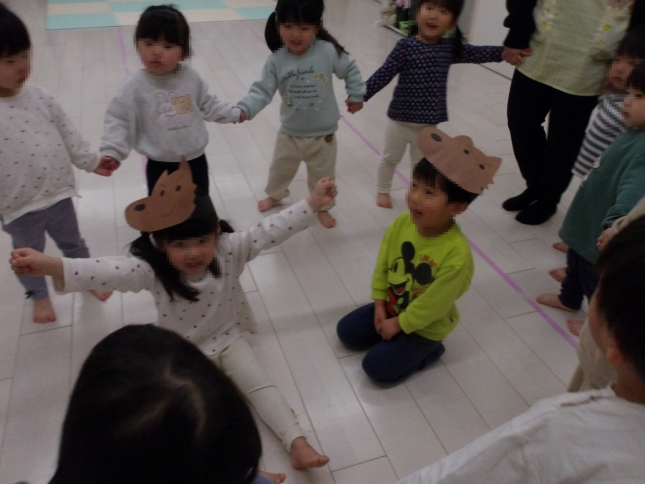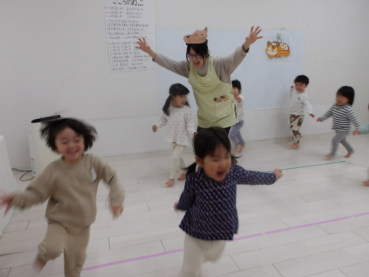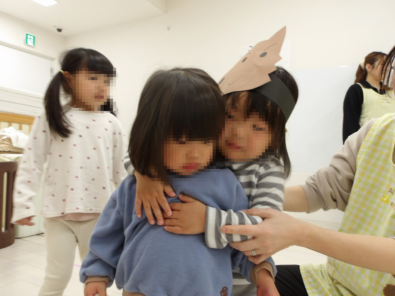 オオカミ役を決め、他の子どもはみんなで手をつなぎオオカミさんの周りを回ります。オオカミ役は歌に合わせて服を着たり、帽子をかぶる真似をして、準備ができると歌に合わせて追いかけます。周りを回っていた子ども「キャー」と言いながら嬉しそうに逃げ、オオカミ役は「ガオー!」と笑顔で追いかける子ども達でした(^-^)。