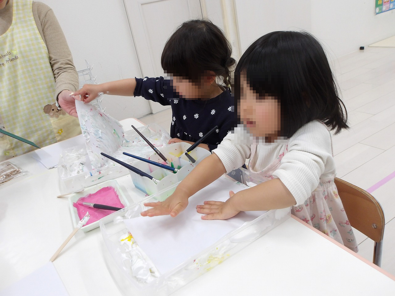 クリームの入った箱に好きな色の絵の具を垂らし、箸で混ぜます。その上に紙を置いて軽くポンポンして、ゆっくり引き上げると完成。