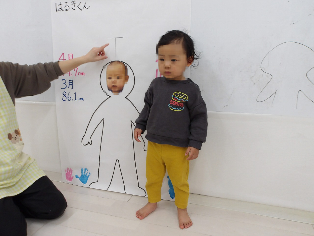 数字遊びプログラムは去年の4月から3月までにどれくらい大きく成長したか比べてみました。身長では4月の自分と今の自分を比べ、体重は増えた分のお米を持ってみました。 みんな大きくなりましたね!