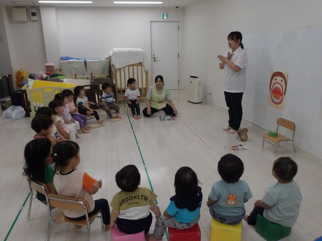 6月4日虫歯予防デー、歯磨きの大切さを知るためのお話を先生から聞いた子ども達(^-^)。