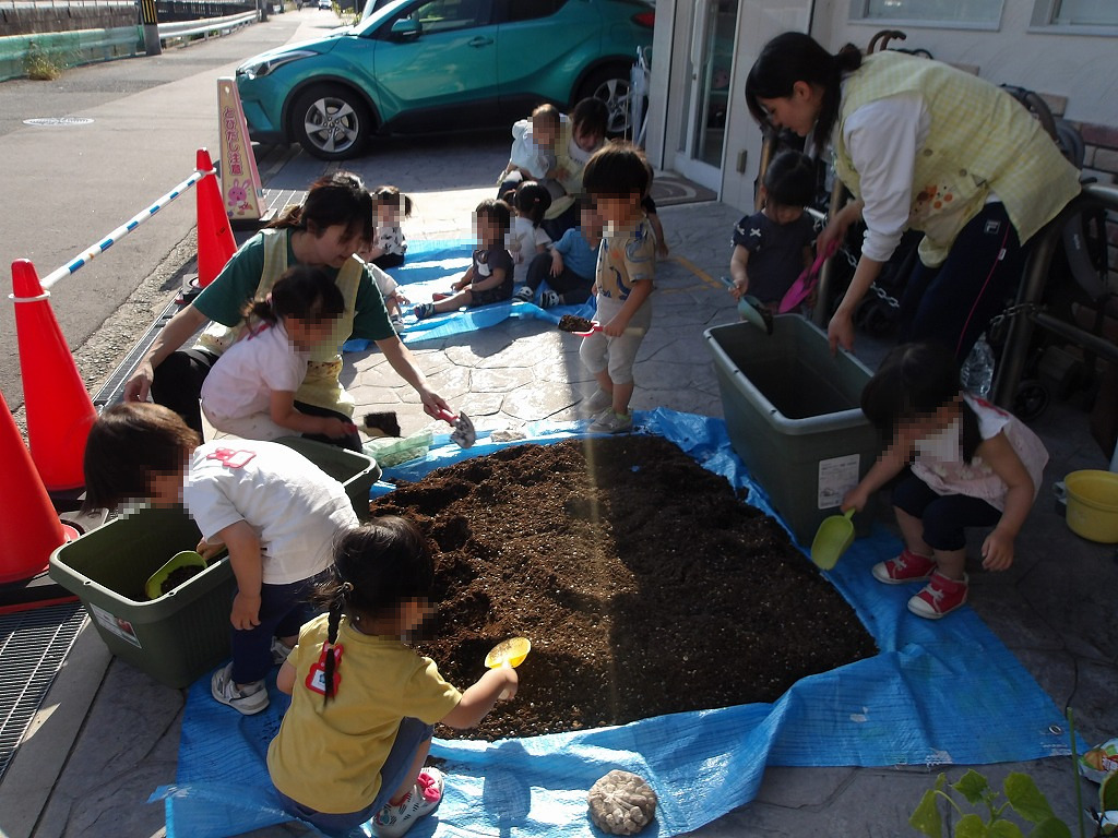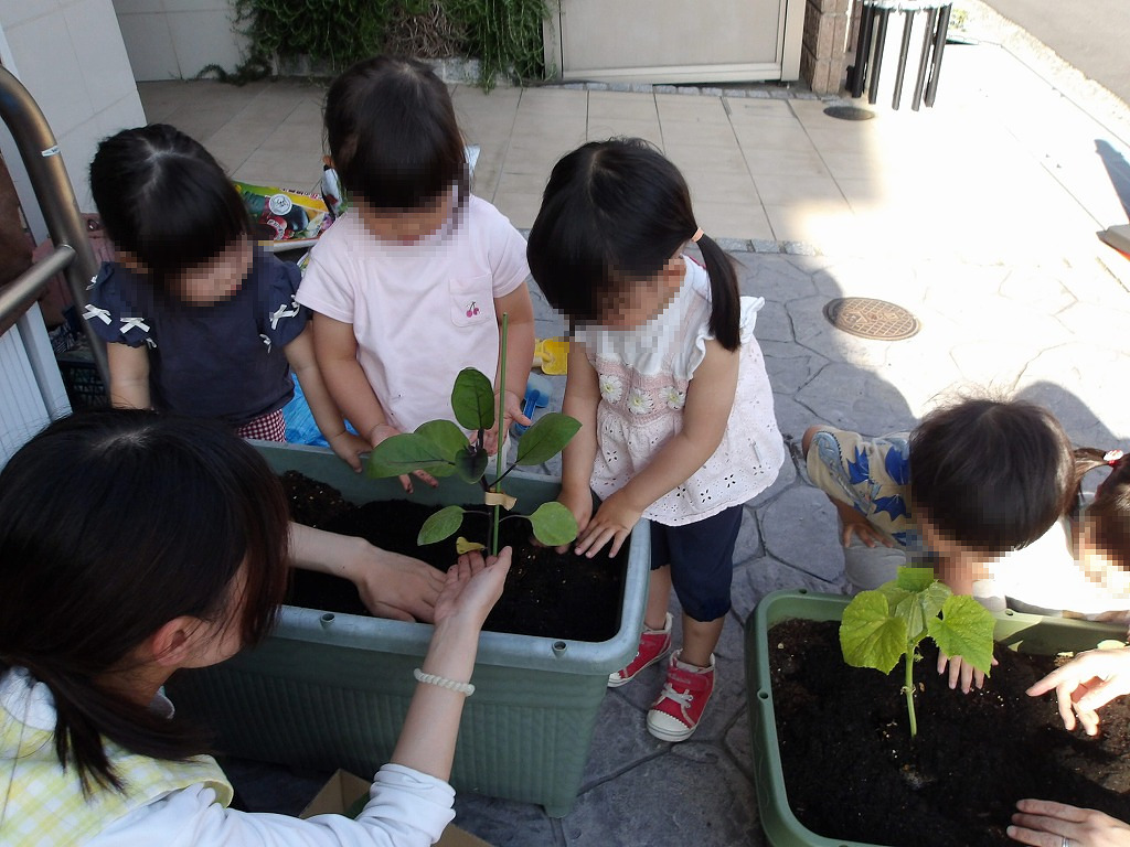 夏野菜(きゅうり、なす、かぼちゃ)の栽培をしました。 子ども達がプランターに石と土を入れ、少し穴を掘り苗を入れ、優しく土をかぶせて水をやりました(^-^)!