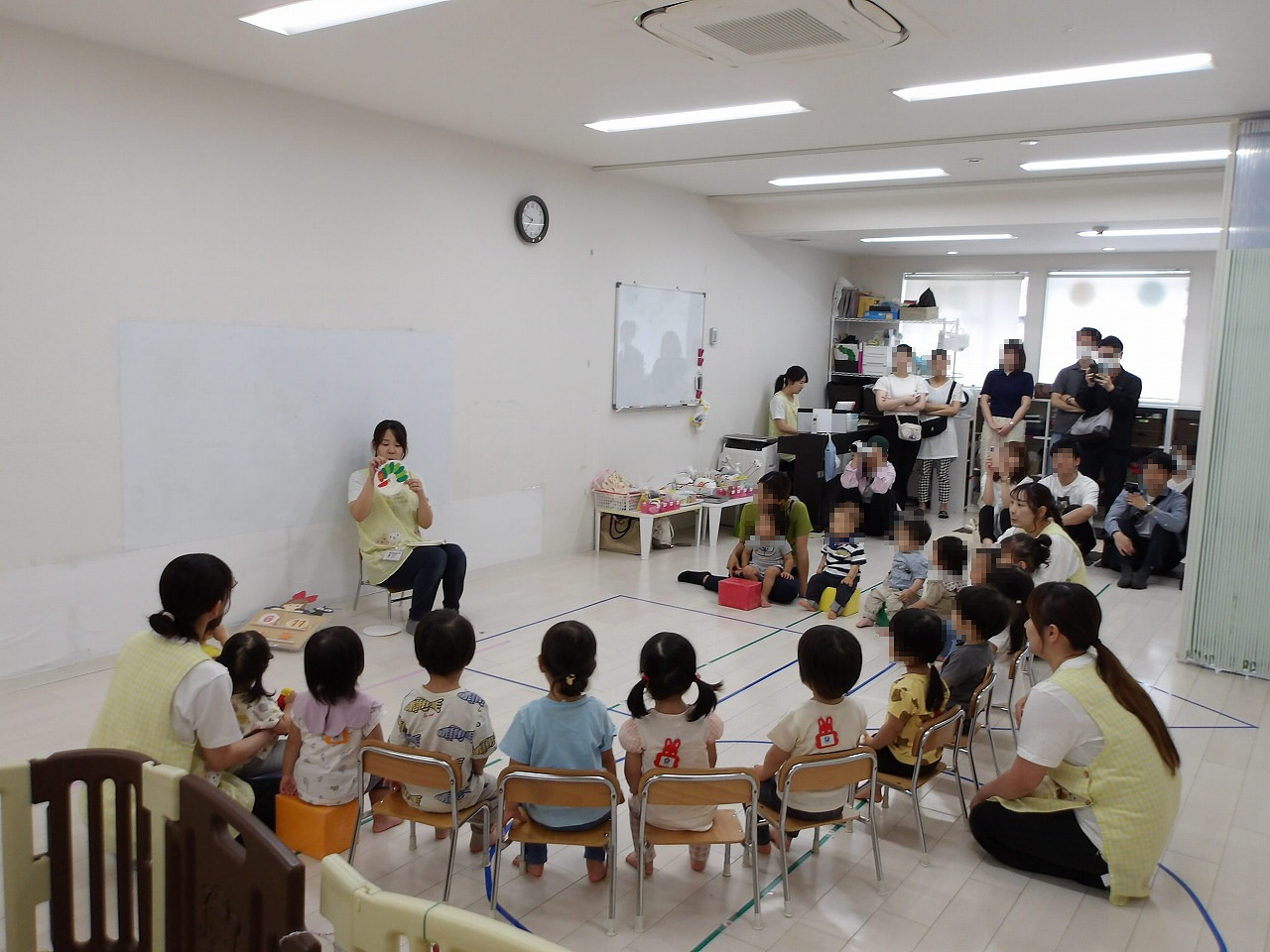 お父さん、お母さんのお顔を見て大泣きしちゃう子どももいましたが、最後はお父さん、お母さんと一緒にふれあい遊びを楽しめ ました(^-^)。