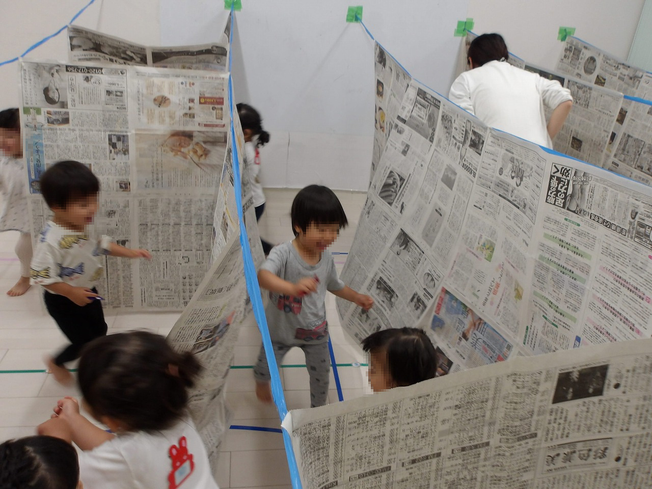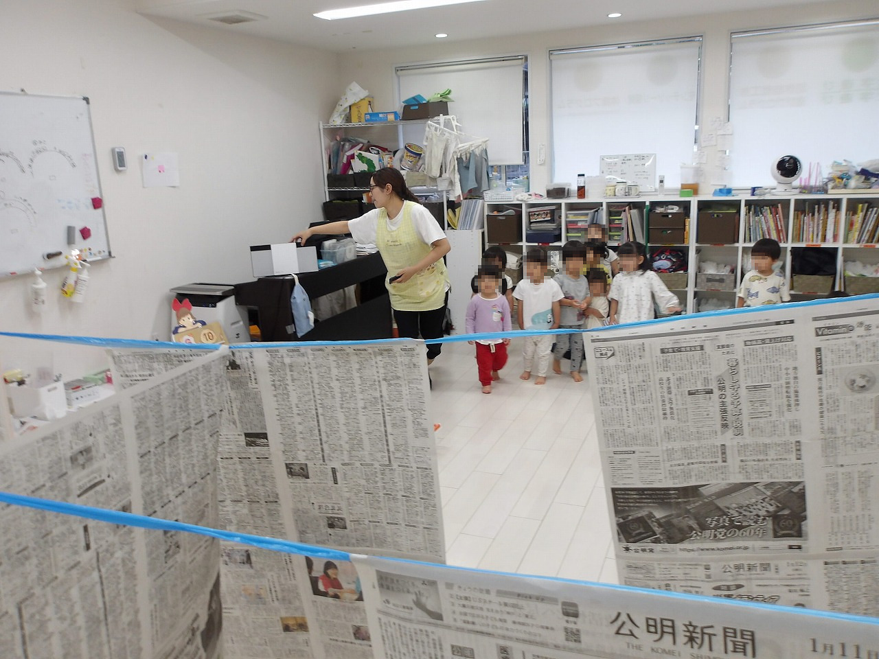 今週、雨の日に室内遊びで迷路(新聞紙とスズランテープで)をして遊びました(^-^)。