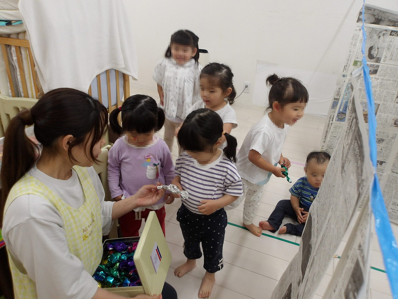 ゲームの内容は、新聞紙にぶつからないように入口からはいり、奥の出口で宝物をもらい戻ってくるゲーム、途中で宝物を持っているのを警察役のY先生に見つかると捕まります。