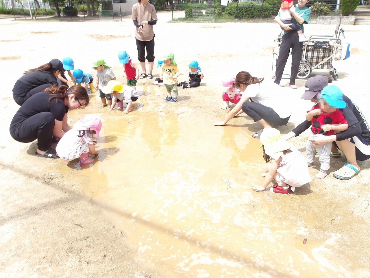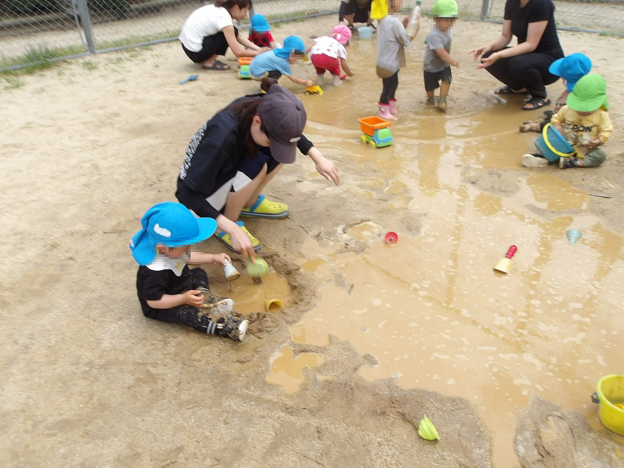 みんなで水たまりに入り、手を泥に入れ感触を楽しんだら泥んこ遊びスタート!