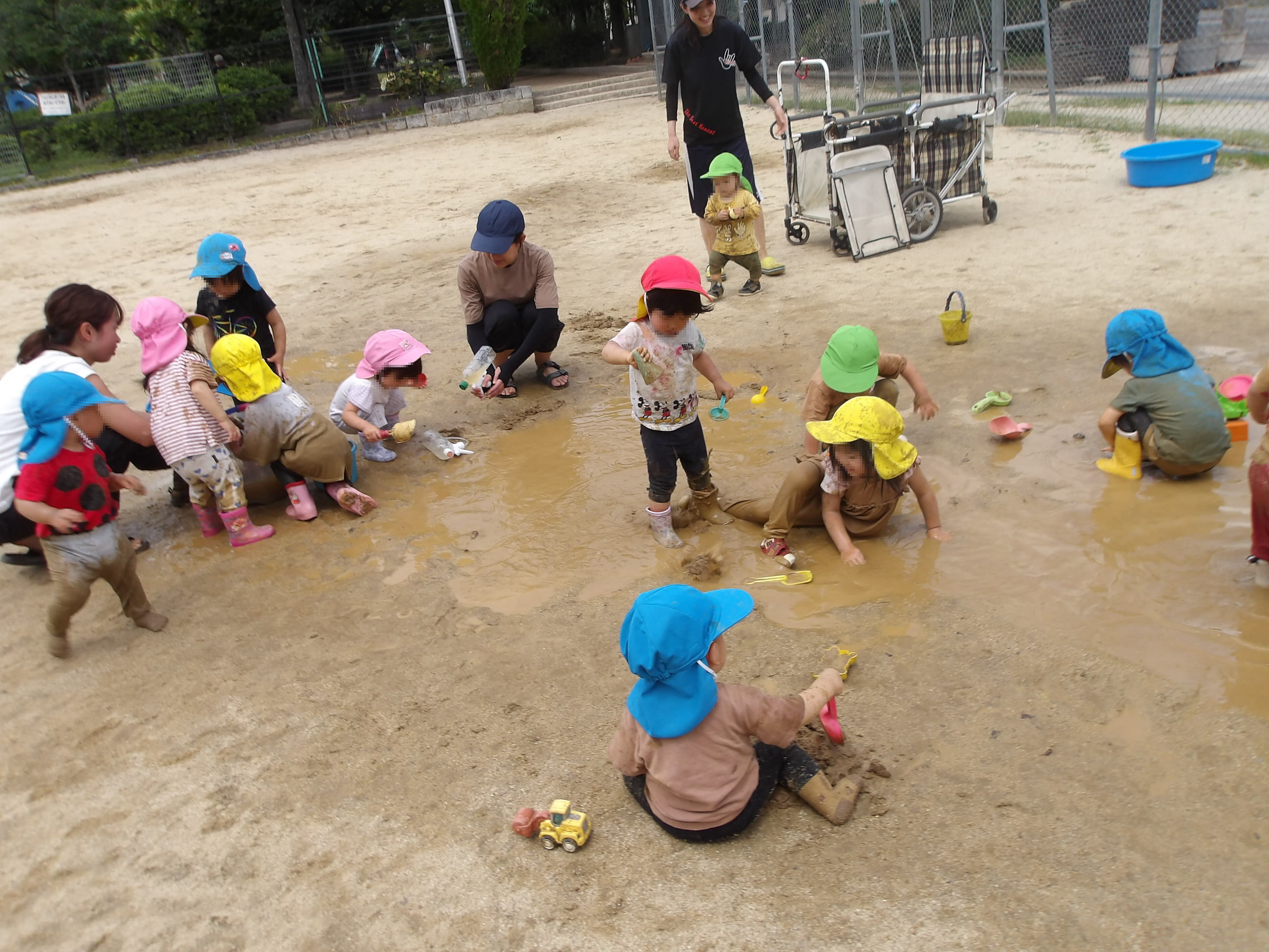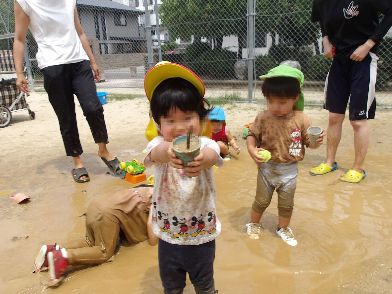 水たまりをピチャピチャと走ったり、手でたたいたりして楽しむ子ども達や、泥のシェイクを作ったり、水鉄砲を楽しむ子ども達も (^-^)。