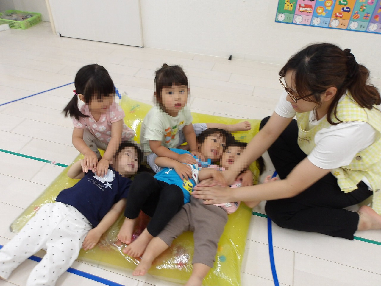 この日は圧縮袋に色水とスポンジの玩具を入れてウォーターベッド遊びをしました。ウォーターベッドの上に寝転び「冷たい!」と浮かんだり、四つん這いになり手で水を押して波を作くったり、先生と「きゅうりができた」を歌い、ふれあい遊びをしました(^-^)!