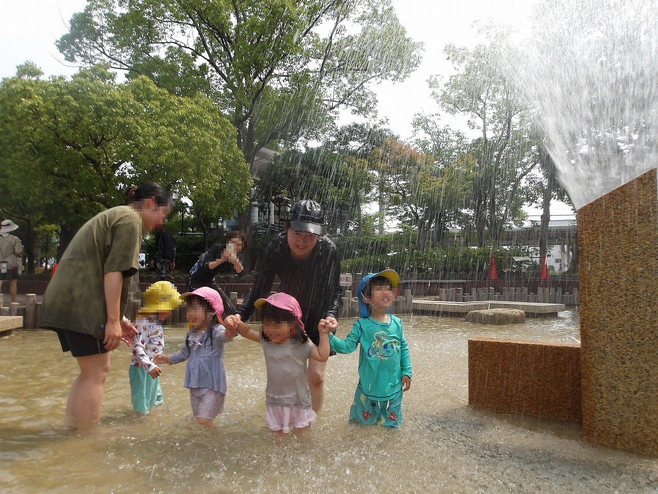着くと水着に着替えて水遊びスタート!まずは体がびっくりしないように少しずつ水をかけ、みんなで水につかります(^-^)。次は前にいる人へバシャバシャかけたら、みんなで噴水の周りを一周して、滝と岩組ゾーンに向かいます。