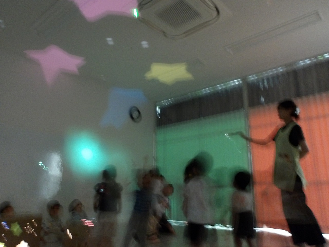 先生から七夕のお話を聞いた後、お部屋を暗くしてプラネタリウム遊びをしました。いろんな色の星を楽しそうに追いかける子ども達でした(^-^)。
