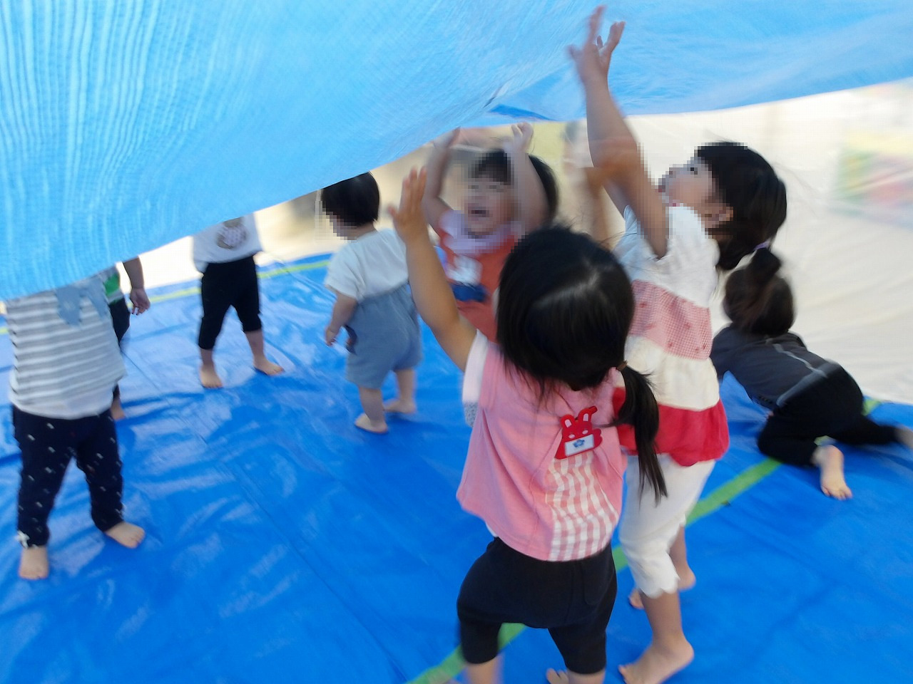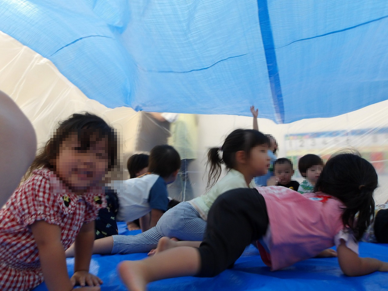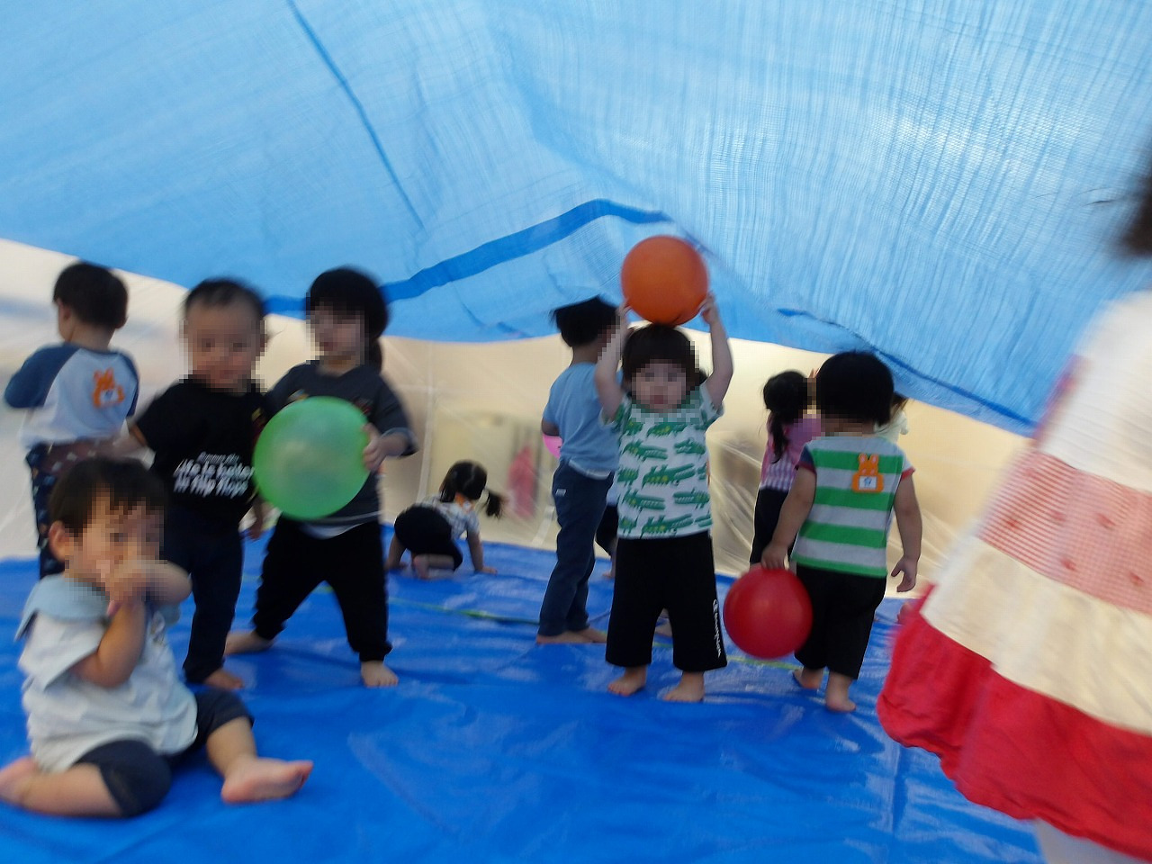 この日は先生が作ったビニールハウスで遊びました。お部屋の中に、もうひとつお部屋ができて不思議な感じの子ども達、中に入るとサーキュレーターの風でフワフワ揺れる天井を見て、嬉しそうにビニールハウスを触ったり、寝転んだり、風船を飛ばしたりして遊びました(^-^)。