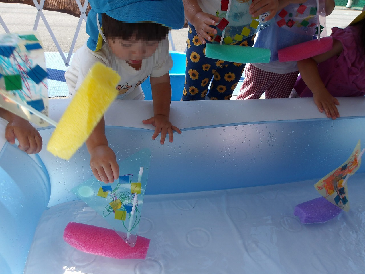 水の入ったプールとタライにお舟を浮かべて遊んだ子ども達、いつの間にか水鉄砲や魚の玩具等も入れて、水遊びを楽しむ子ども達でした(^-^)。